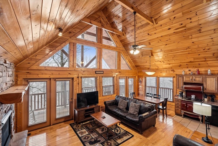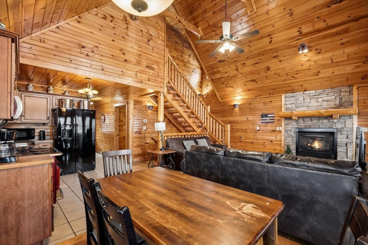 The main living room features vaulted ceilings, large windows, and a gas fireplace—perfect for relaxing after a day in the mountains. - Well-Equipped Kitchen & Dining