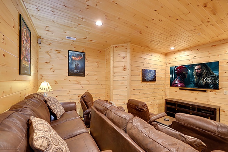 Dive into fun in the fully stocked game rooms offering pool, foosball, air hockey, and arcade games. Enjoy cinematic nights in the private home theater with premium sound, and stay connected with 13 flat-screen TVs. - Hot Tubs & Spectacular Views