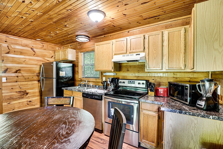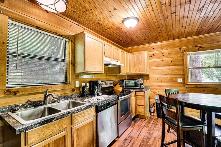 A full kitchen with modern appliances makes home-cooked meals easy, and a charcoal BBQ on the deck adds to the al fresco dining experience. This cabin uses a private well water system with naturally hard water. The water is safe to consume and does not have sulfuric odors. - Additional Conveniences