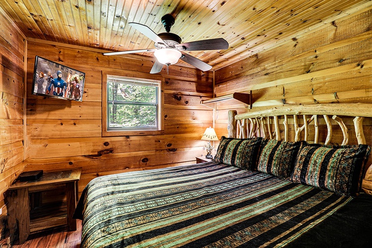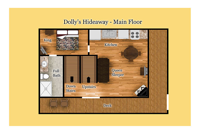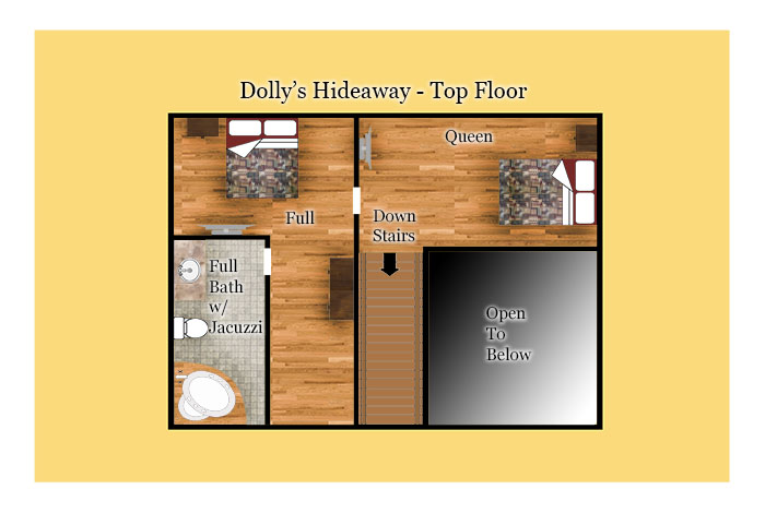 Tucked away offsite in Sevierville and just minutes from Dollywood, Dolly’s Hideaway is a charming 2-bedroom, 2-bathroom cabin that sleeps up to 8 guests. This tranquil retreat combines rustic warmth with modern comforts—ideal for families, friends, or couples seeking a peaceful Smoky Mountain escape.