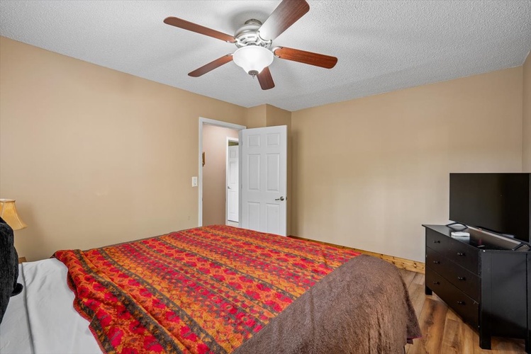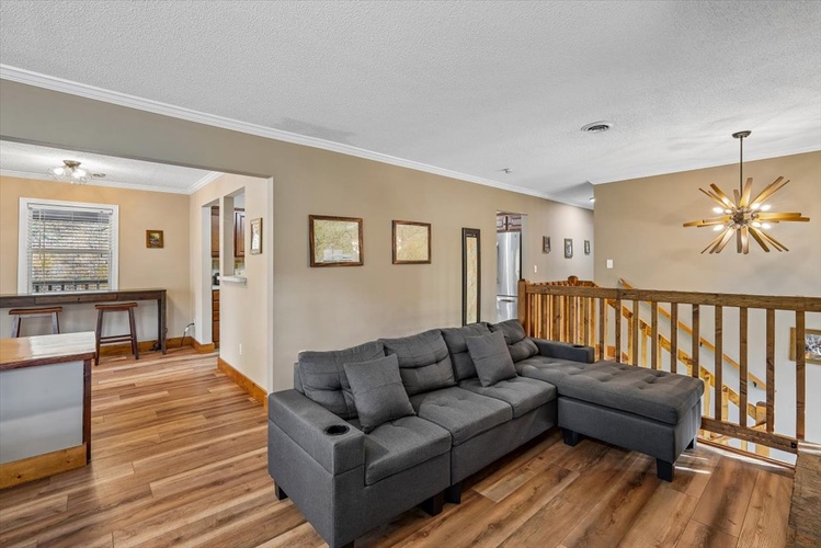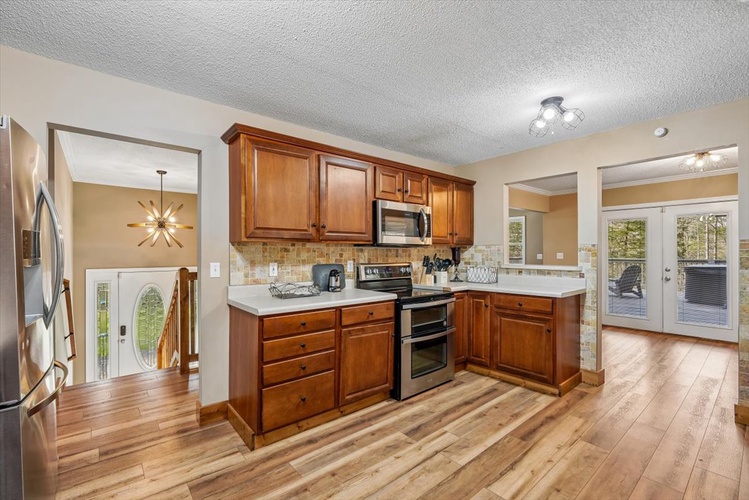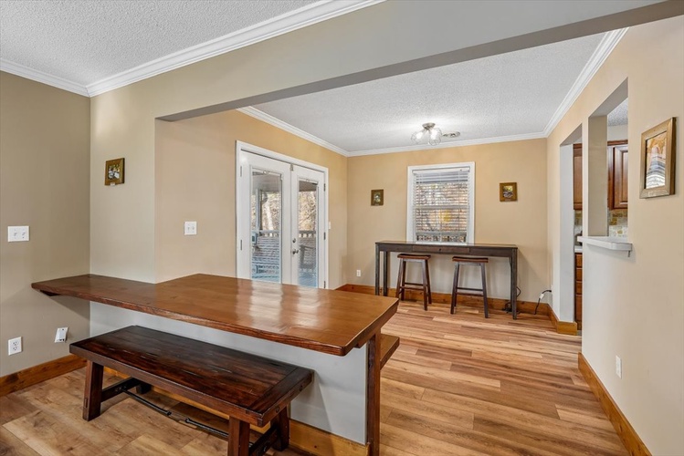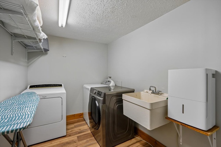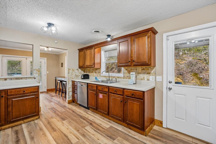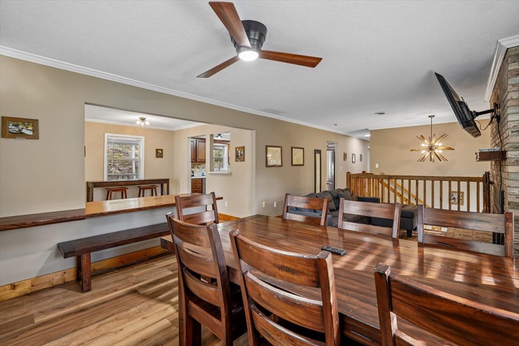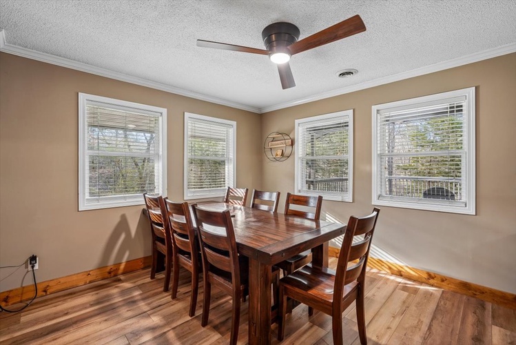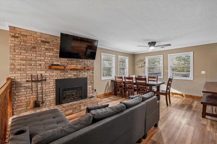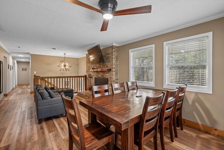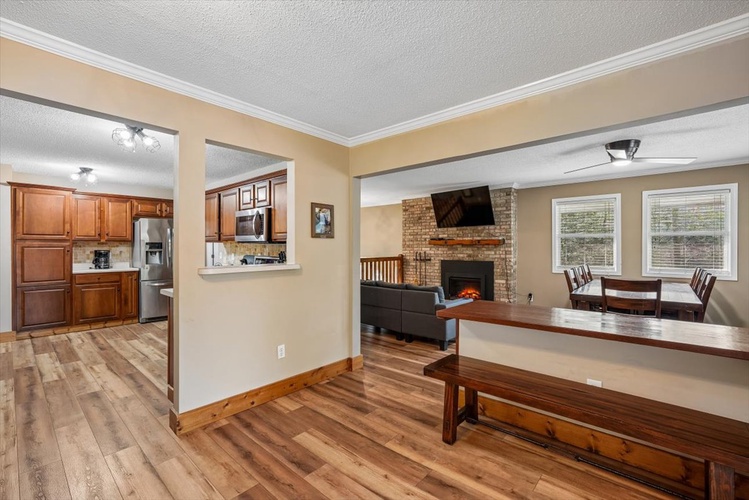 Cozy up in the great room, warmed by a stone fireplace. The full kitchen and adjacent dining area make it easy to enjoy hearty home-cooked meals together.