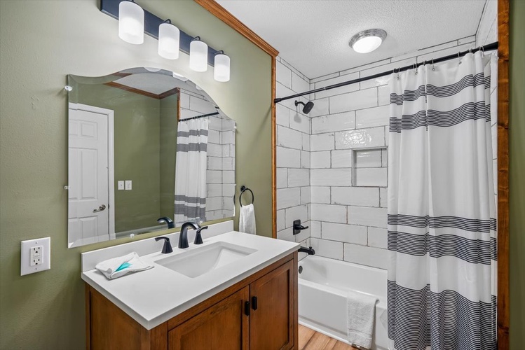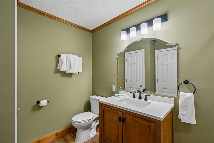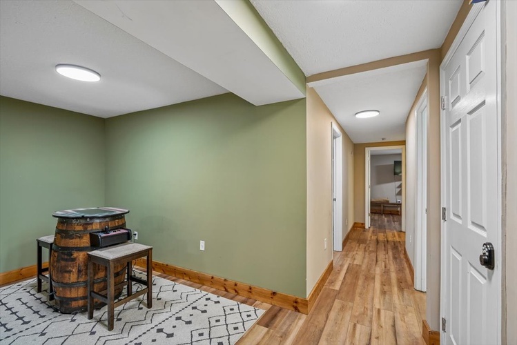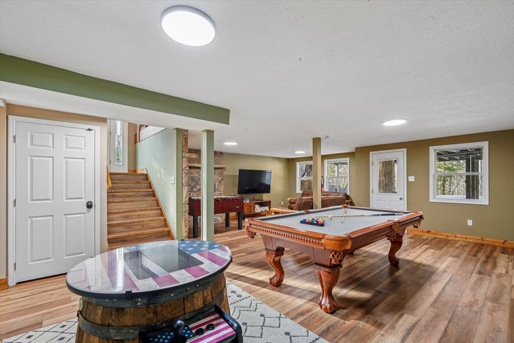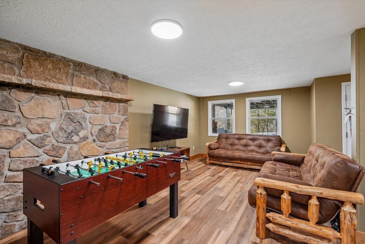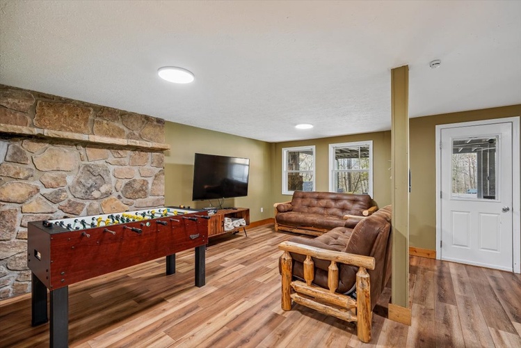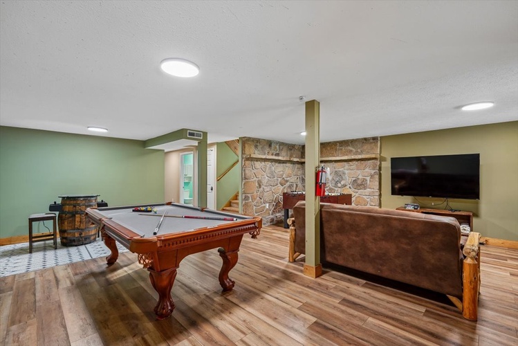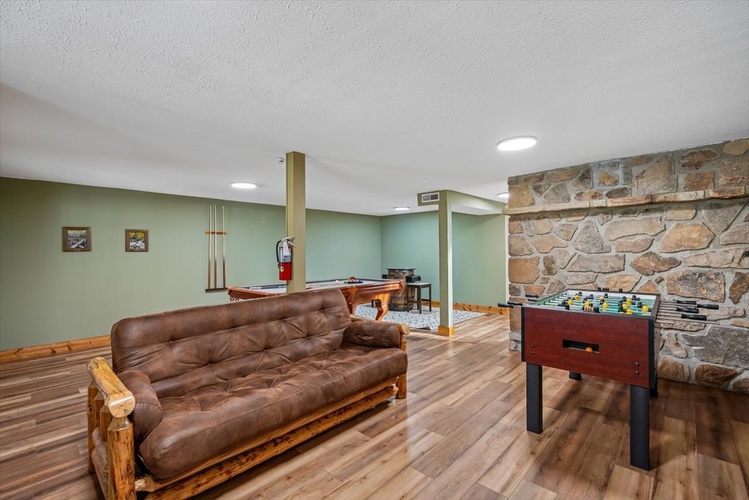 The lower-level game area features a pool table, arcade games, and foosball. Luxuriate in the private hot tub, enjoy movie nights by the fire, or challenge friends to cornhole under your personal picnic pavilion.