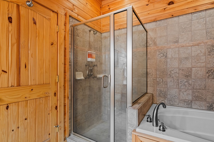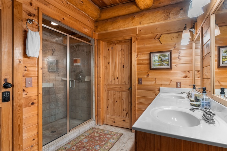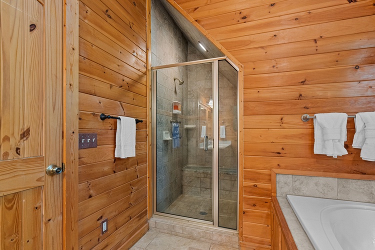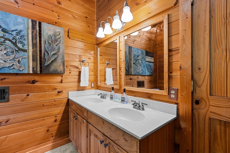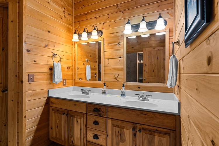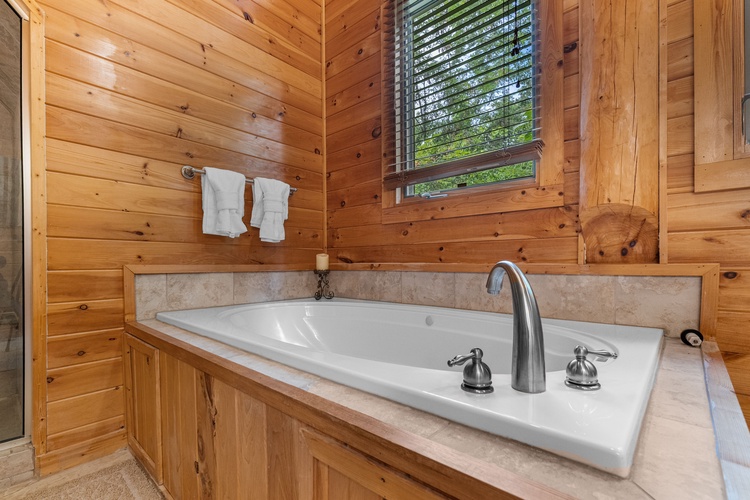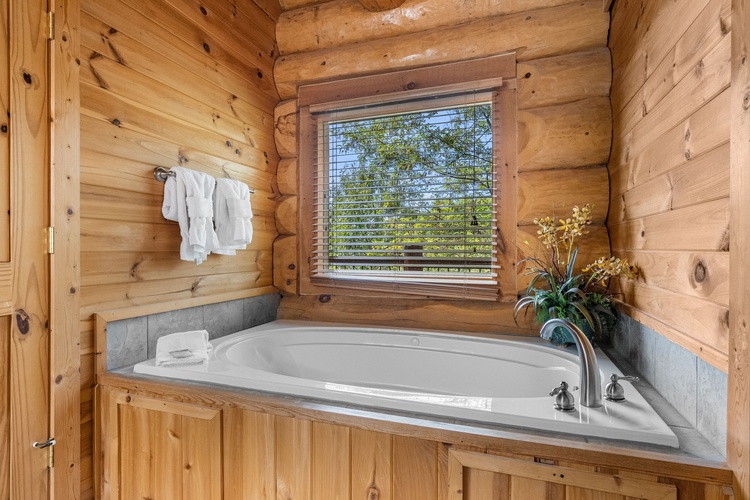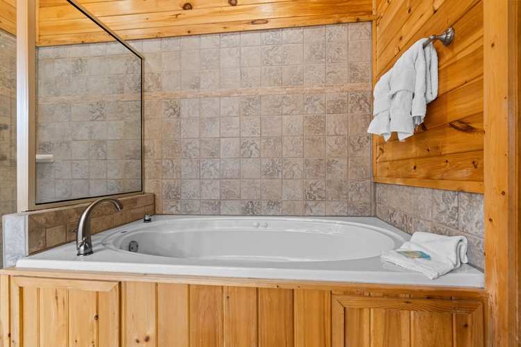Multiple full baths include jetted soaking tubs, designer toiletries, hair dryers, and fluffy towels—ideal after a day in the park.