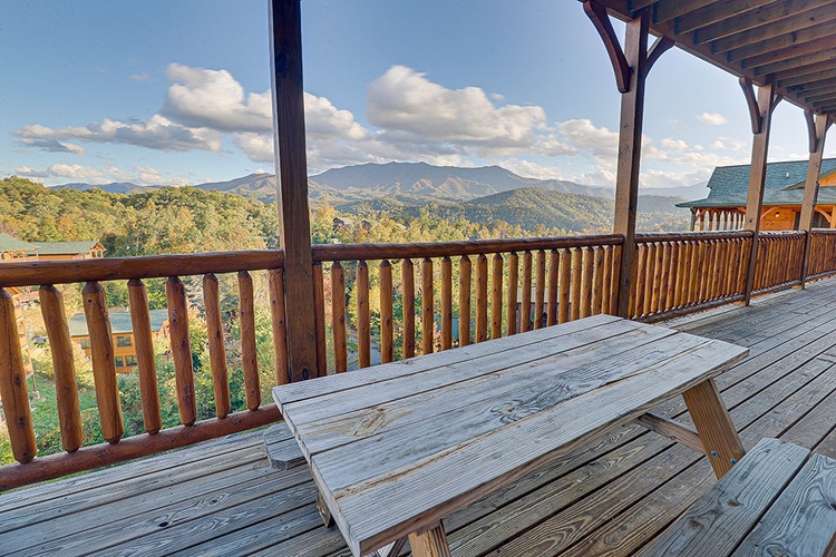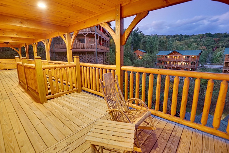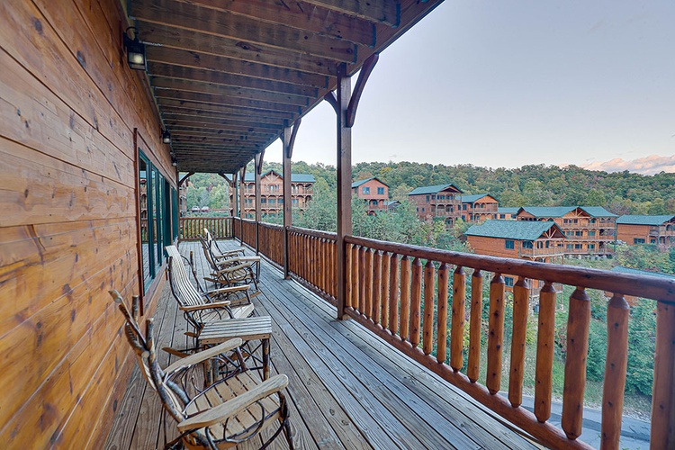 The expansive wraparound deck is outfitted with numerous rocking chairs, offering unobstructed views of the Great Smoky Mountains—perfect for sunrise reflections or evening relaxation. - Ample Space for Large Groups