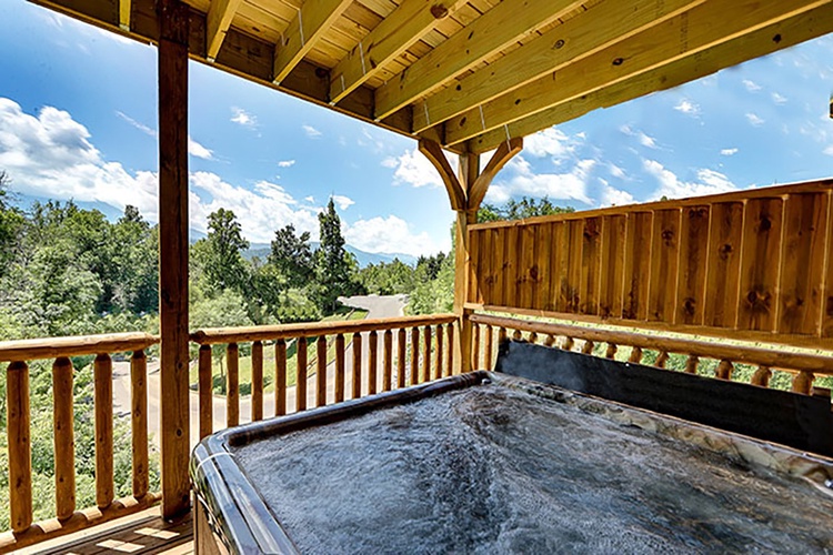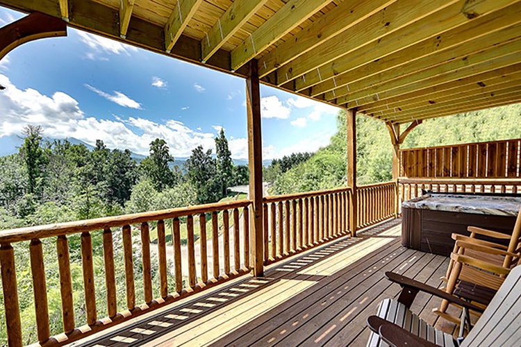 A private hot tub on the deck overlooks wooded mountain scenery, complemented by outdoor rocking chairs ideal for morning coffee or evening chats. - Full Kitchen & Gathering Spaces