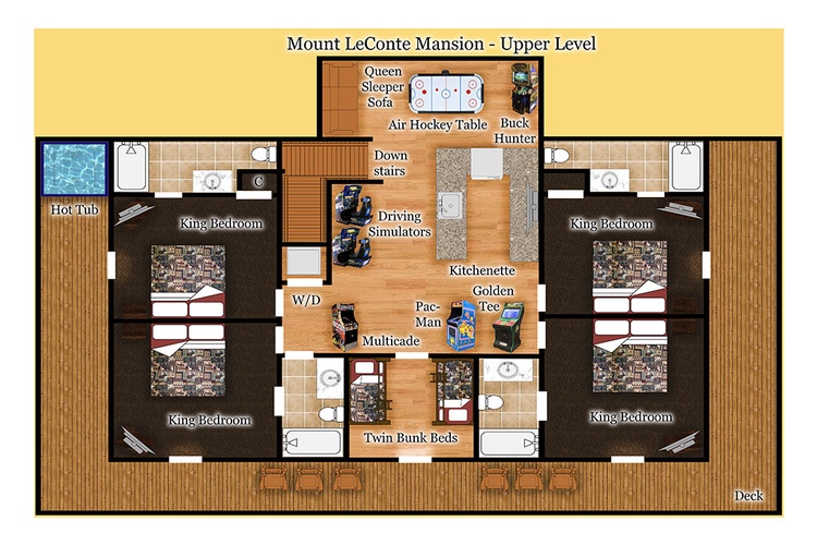 Experience the pinnacle of mountain luxury at Mount LeConte Mansion, a stunning 10-bedroom, 7 1/2-bathroom cabin nestled within Gatlinburg’s Parkview Resort. Designed to accommodate up to 32 guests, this spacious retreat is perfect for large families, reunions, or group getaways seeking both comfort and entertainment in the heart of the Smokies.