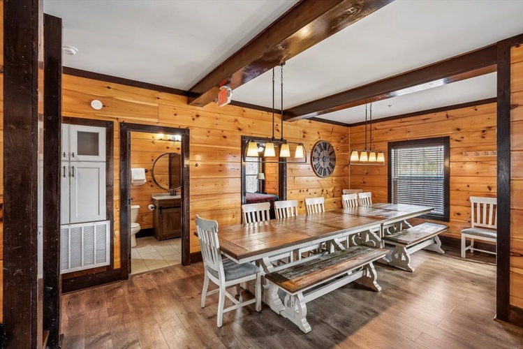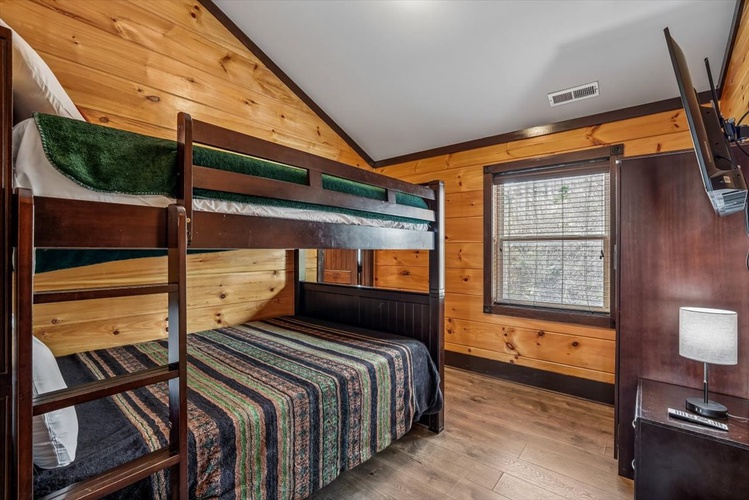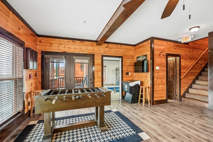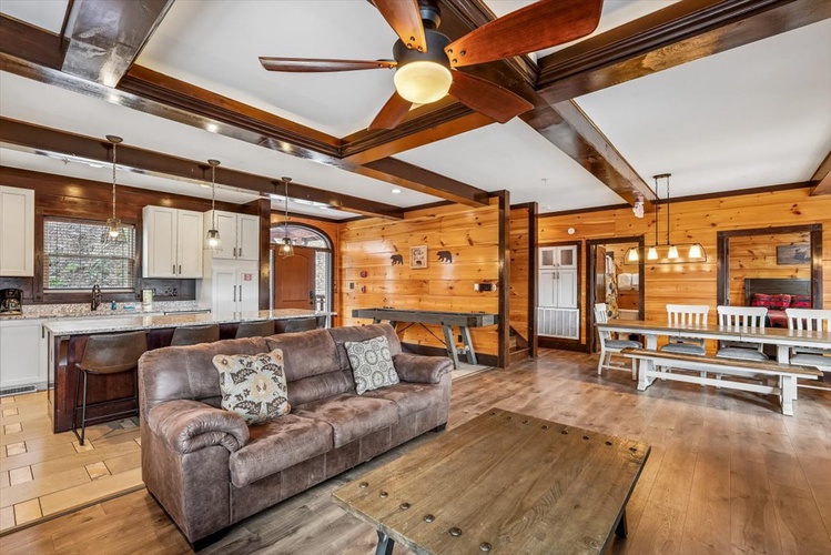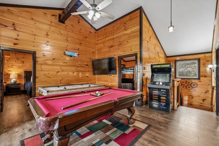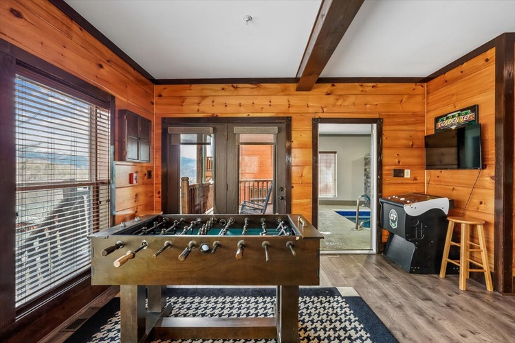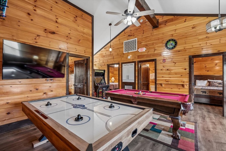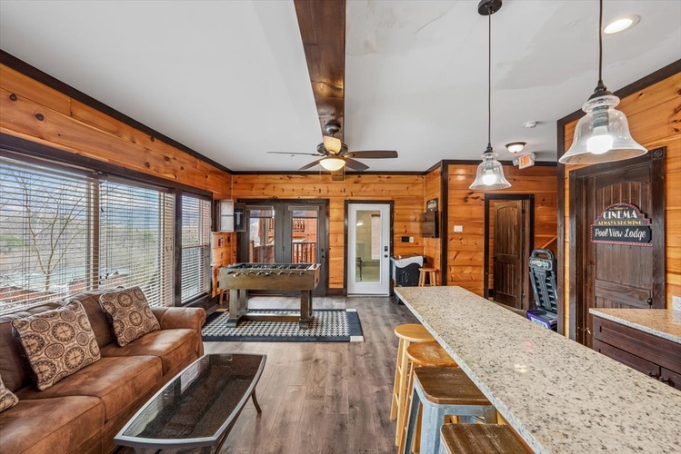 Perched within Hidden Valley Resort near Gatlinburg, Pool View Lodge is a striking 6-bedroom, 6-bathroom cabin that sleeps up to 22 guests. Built in 2020 and designed across three spacious floors, this modern mountain retreat blends upscale entertainment, scenic vistas, and resort comforts—perfect for families, friends, and celebration groups.
