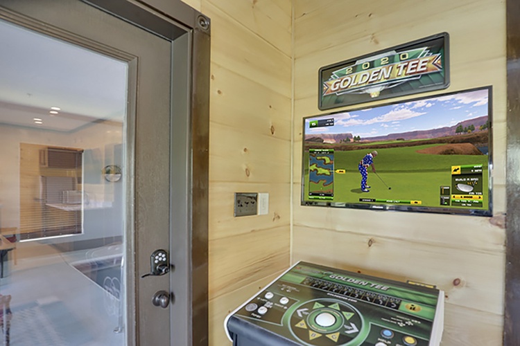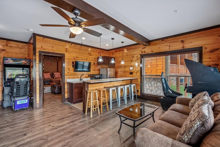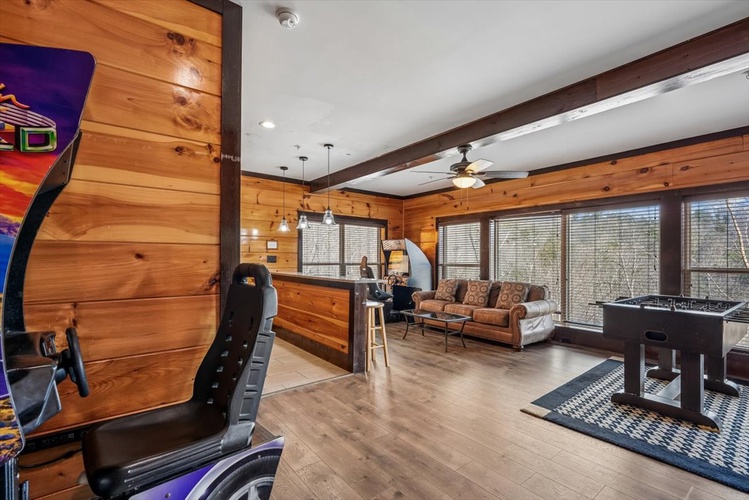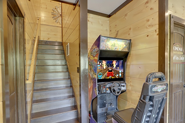 The game-packed lower level includes arcade machines, pool table, foosball, air hockey, shuffleboard, and a driving simulator—a dream for family game nights. - Home Theater Experience