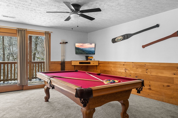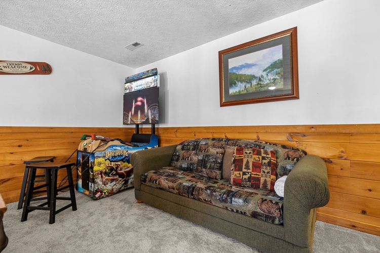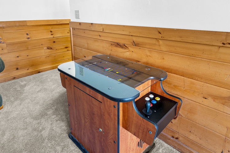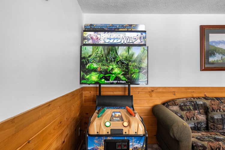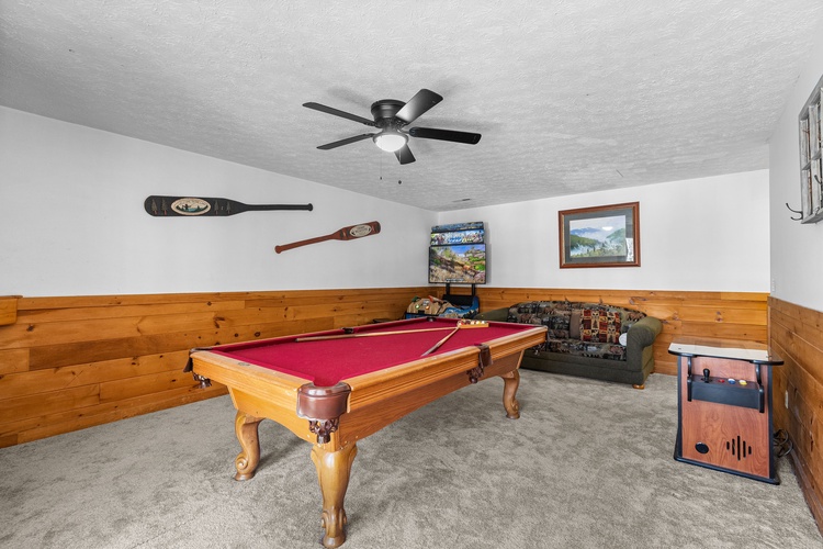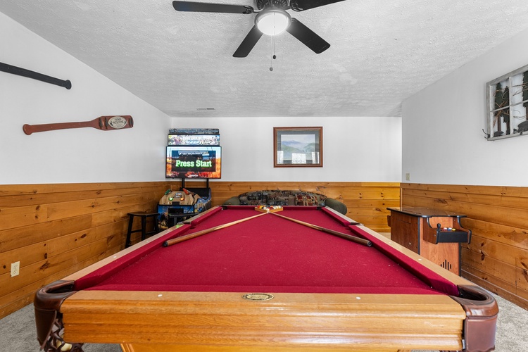 A spacious game loft upstairs features a pool table, multicade arcade (incl. Buck Hunter), plus a cozy den downstairs—perfect for movie nights or kid-friendly relaxation.