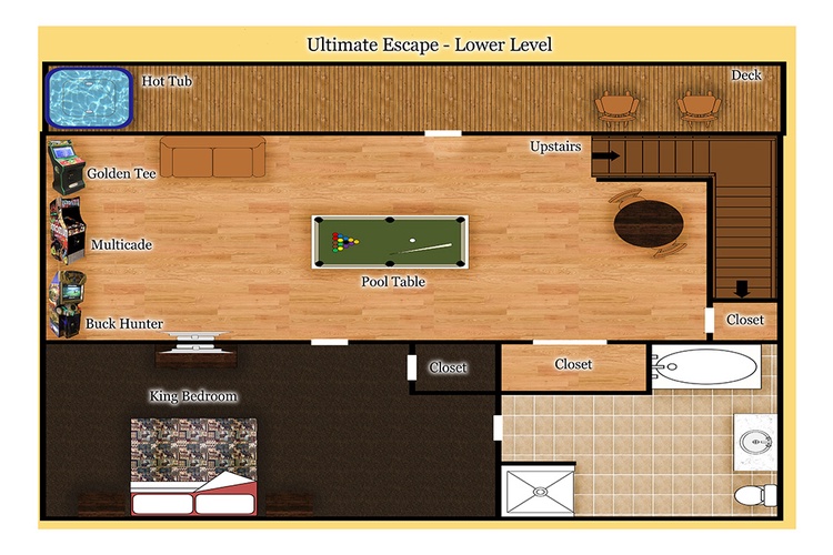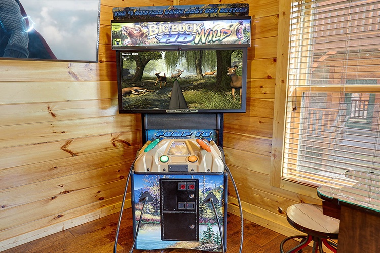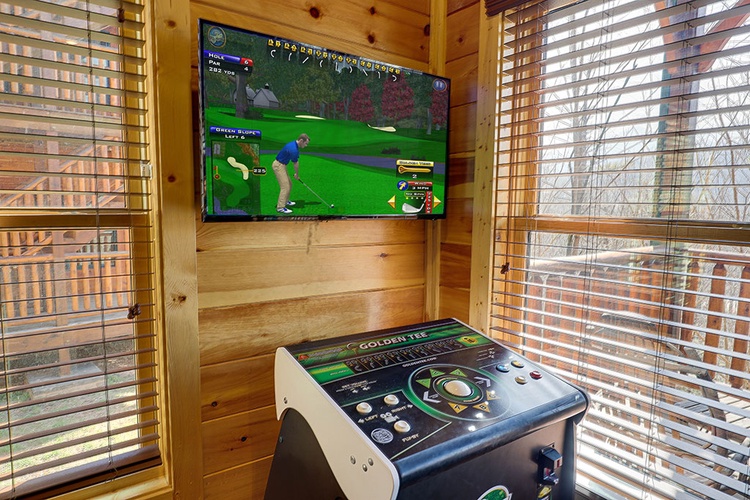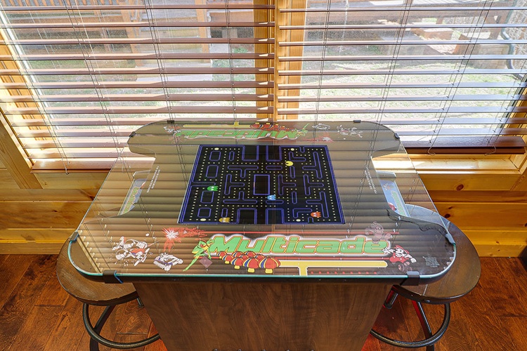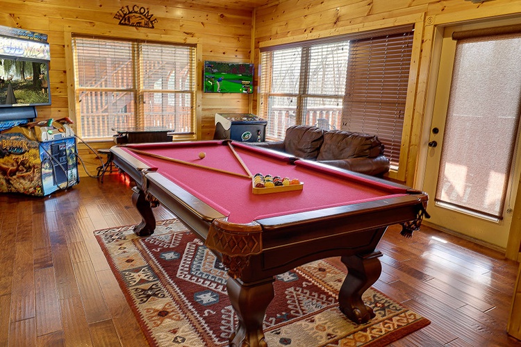 A playful loft area includes classic arcade games (Ms. Pac‑Man, Galaga, Buck Hunter, Golden Tee), plus a pool table and air hockey—perfect for casual family fun or friendly competition. - Outdoor Hot Tub & Deck