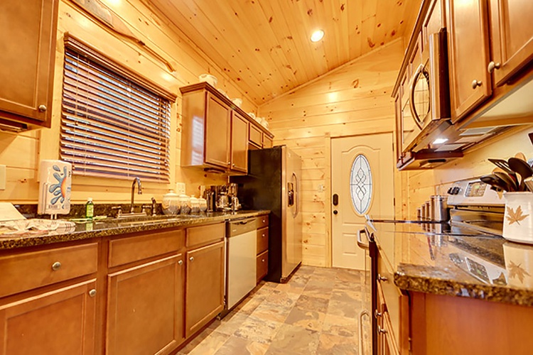 Unwind on the deck’s private hot tub or lounge in Amish rocking chairs while enjoying peaceful mountain views and aromatic morning coffee. - Full Kitchen & Cozy Living Area