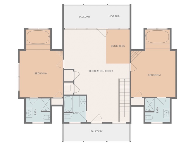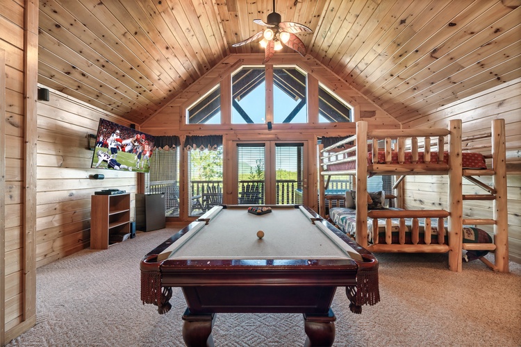 Two king bedrooms on the main level and two upstairs king bedrooms offer elegant comfort, while loft gaming space adds flexible sleeping for larger parties—ideal for families or groups up to 16.