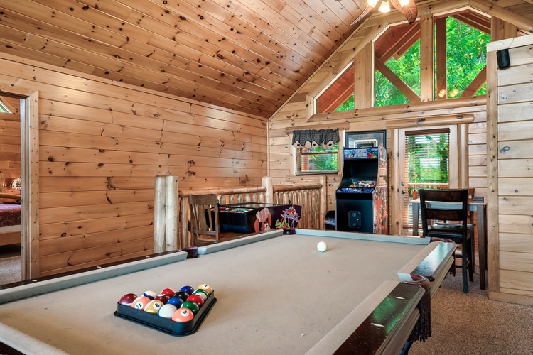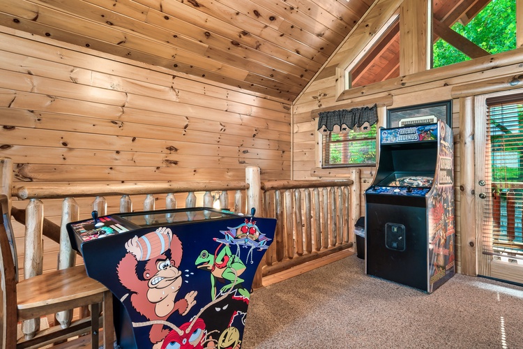 The upstairs loft invites fun with a pool table and dual multicade arcade systems—ideal for game nights or friendly tournaments. - Evening Theater & Relaxing Fireplace