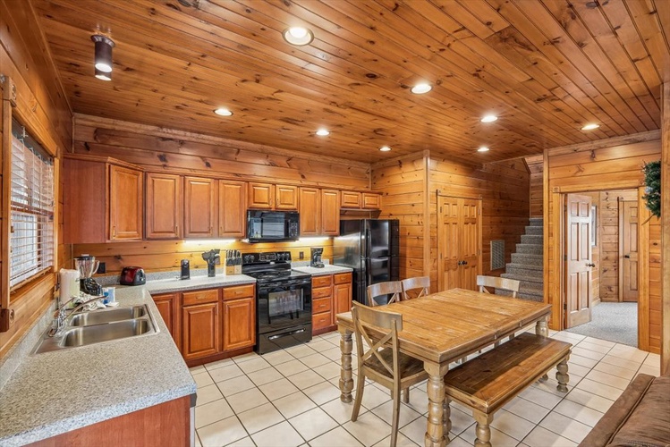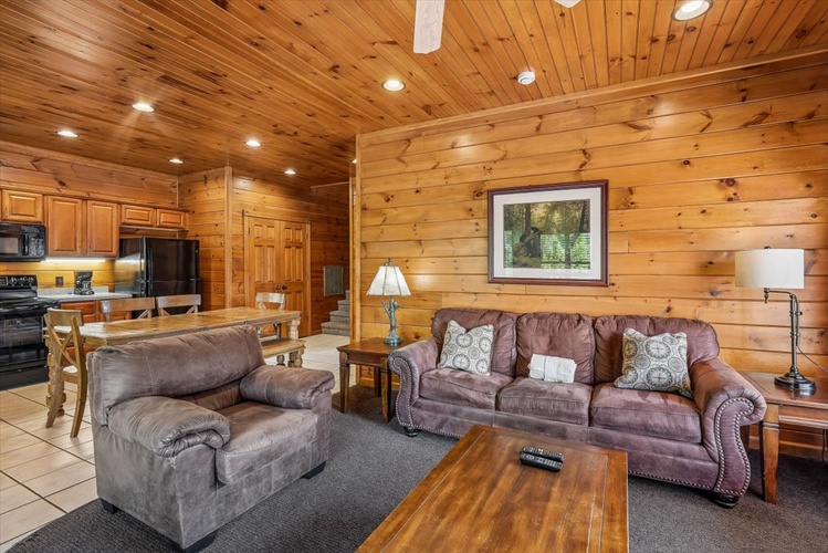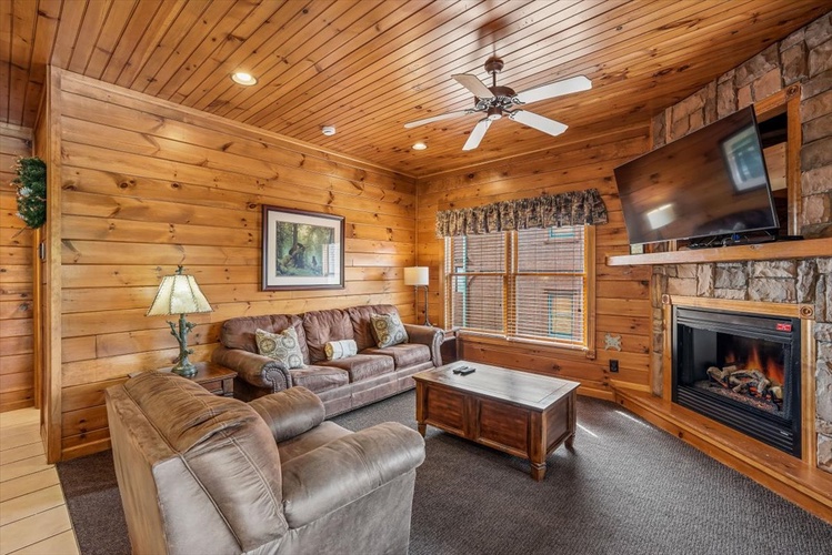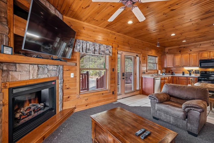 Enjoy peaceful evenings by the electric fireplace or catch up on shows using cable and streaming on multiple TVs throughout the cabin. - Well-Appointed Kitchen & Dining