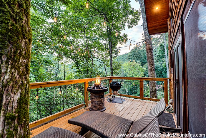 The deck features a fire pit, charcoal BBQ grill, and park swing—ideal for evenings filled with conversation, s'mores, and forest ambiance. - Compact & Cozy Interior