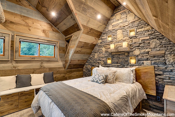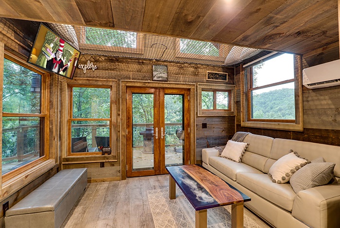 A queen bed and queen sleeper sofa accommodate up to four guests. The smart layout includes essentials like A/C, Wi‑Fi, microwave, and coffee maker—comforts wrapped in cabin character. - Resort‑style Extras