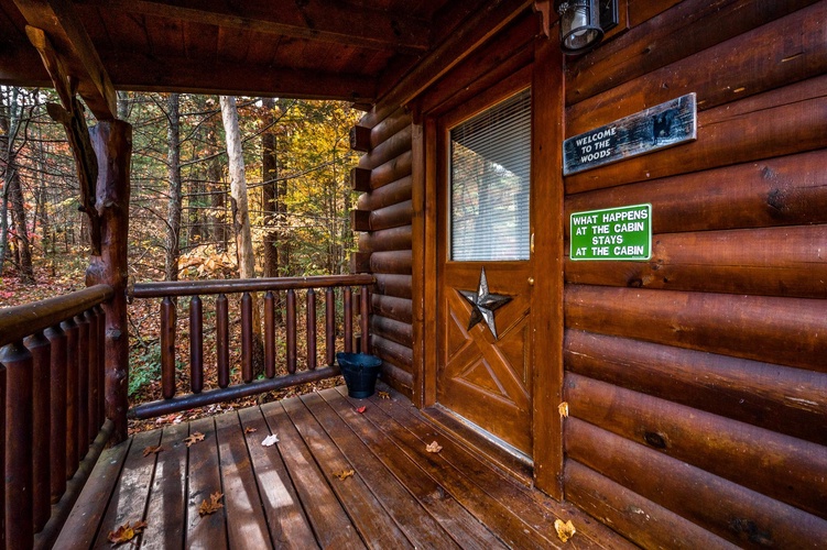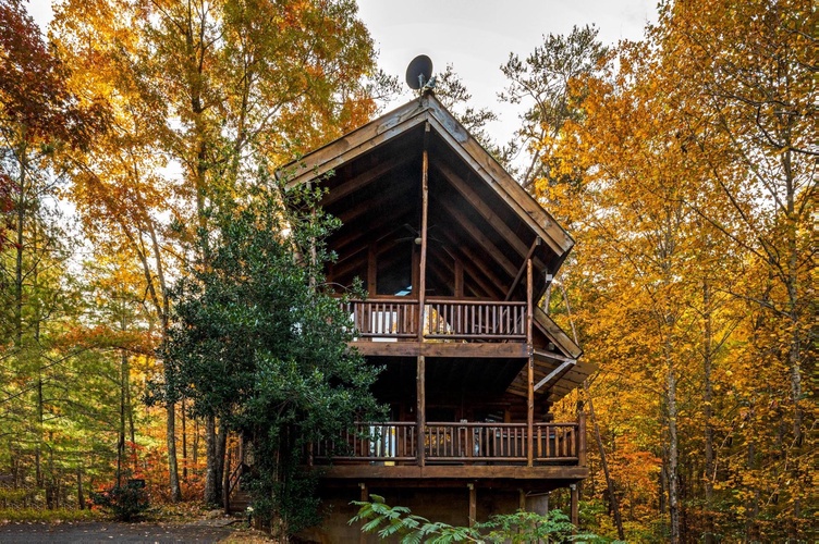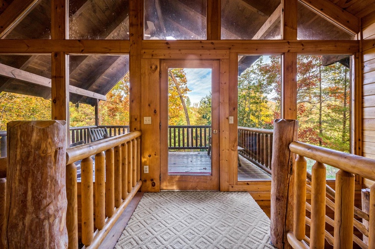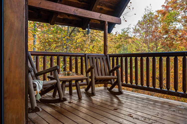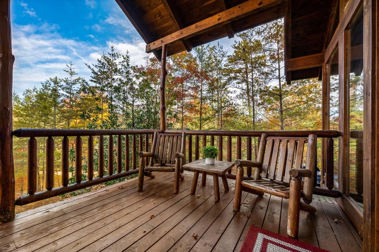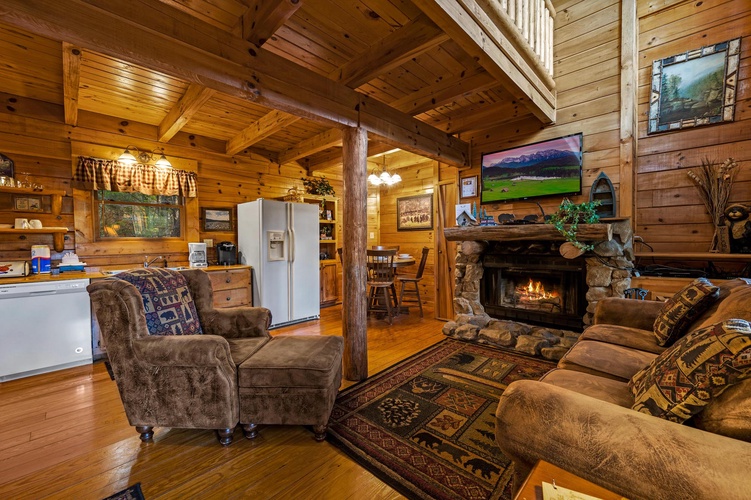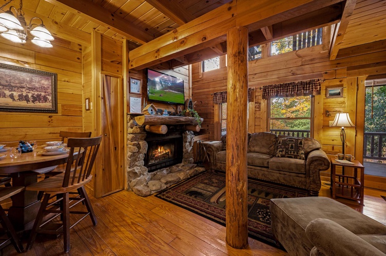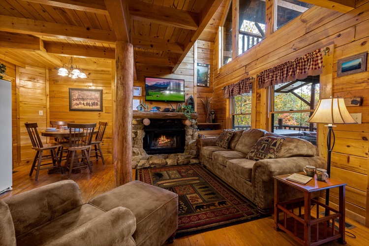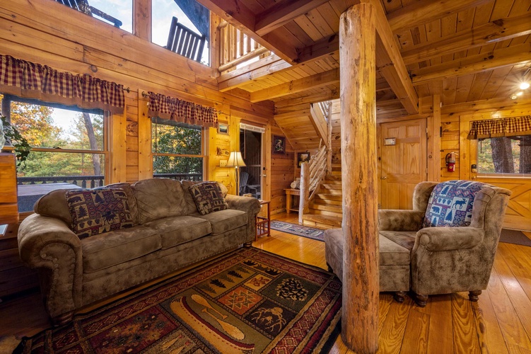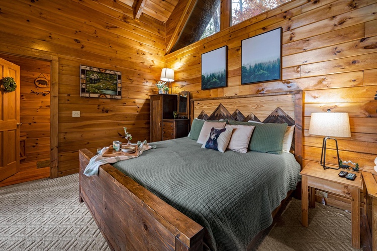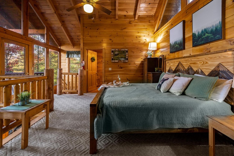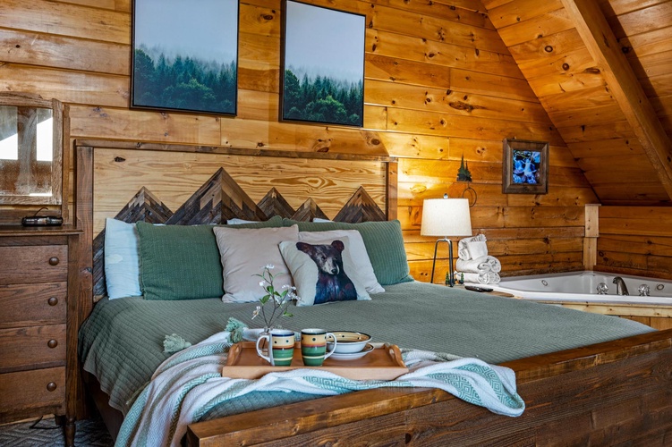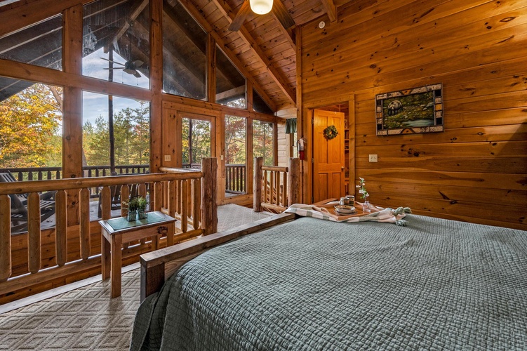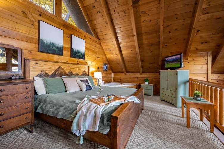 - The cabin features a king-sized bed in the loft, complete with a private jetted tub, television, and access to a private veranda with two rocking chairs. The living room offers a queen-sized sleeper sofa, providing additional sleeping arrangements for guests.