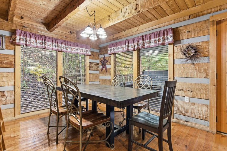 - Full kitchen stocked with essentials, along with a dining table for six for memorable cabin meals.