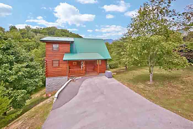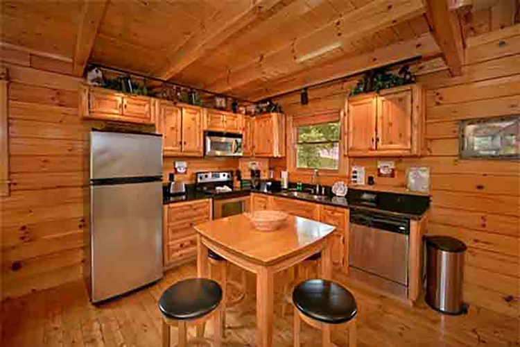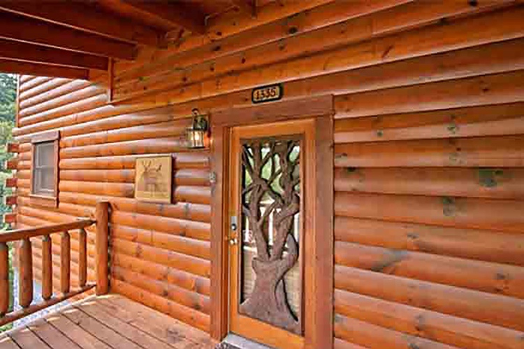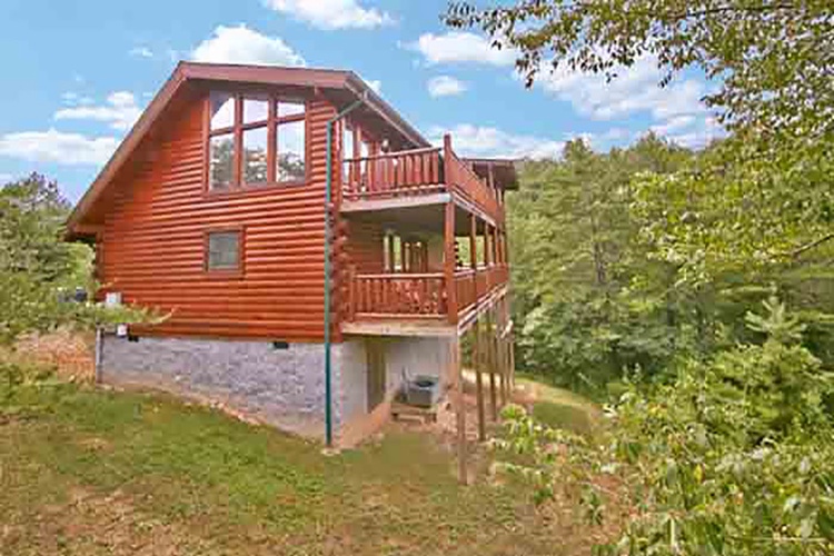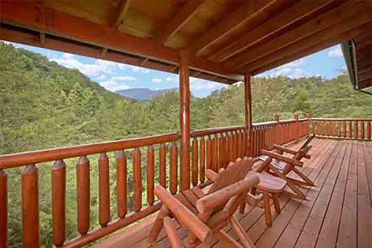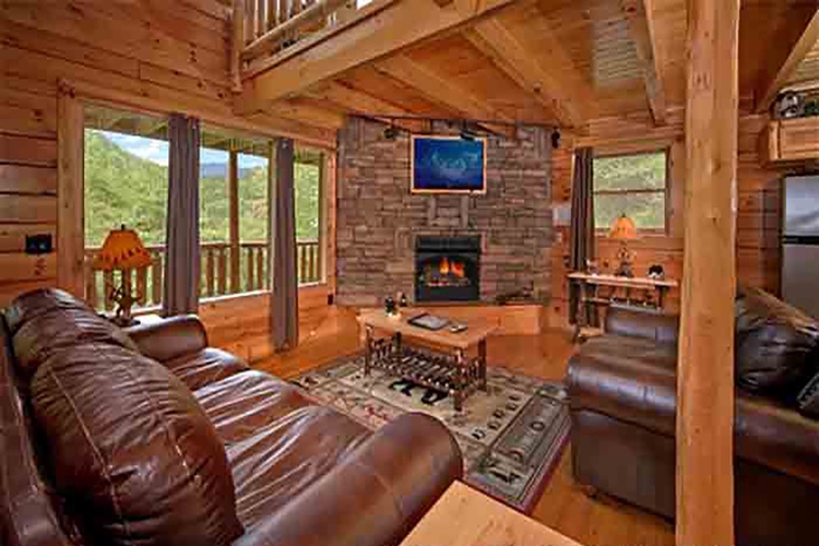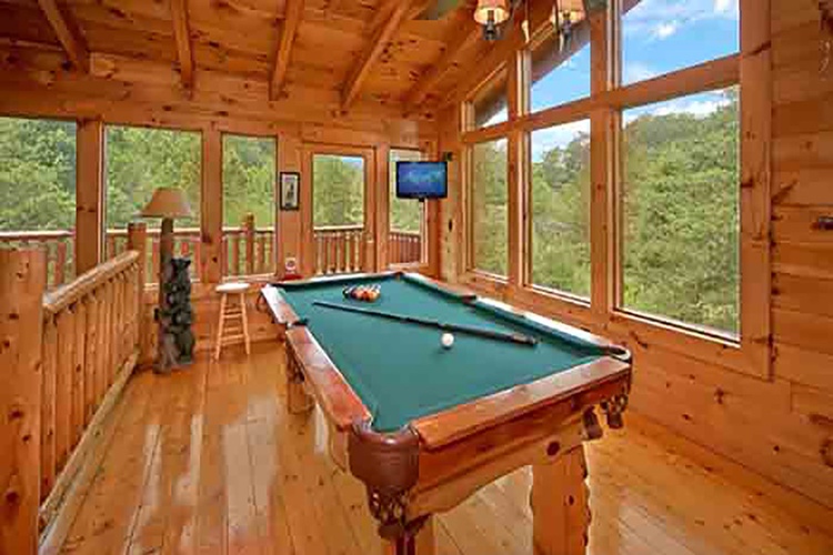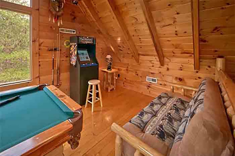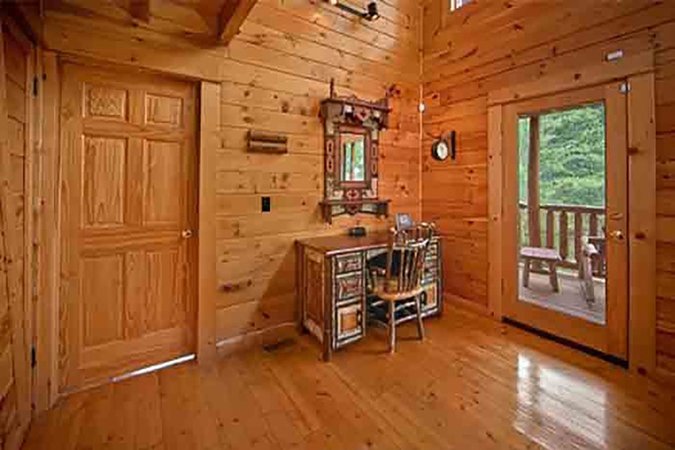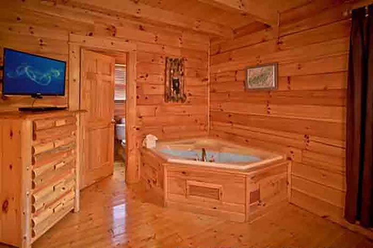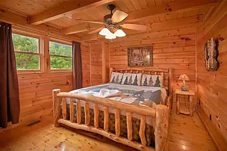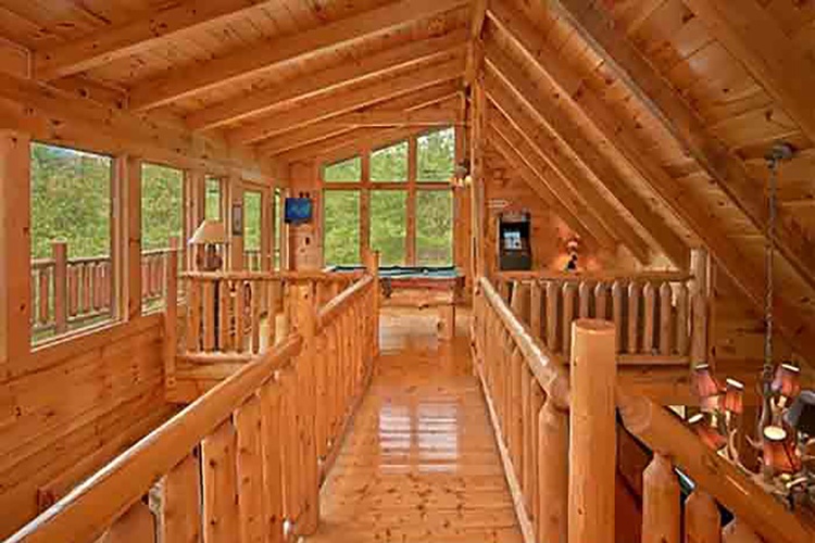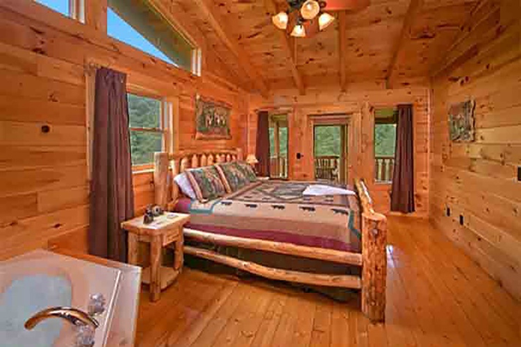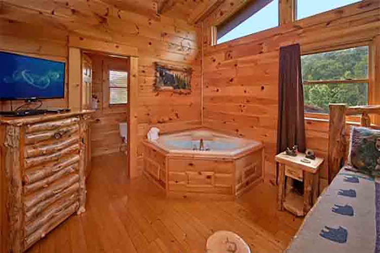 The cabin features two king bedrooms, each with a private en-suite bathroom equipped with a jetted tub and standing shower. The main level bedroom offers porch access, while the upper-level bedroom includes a DVD player and a loft window, providing a cozy and private space for relaxation. - Entertainment Options