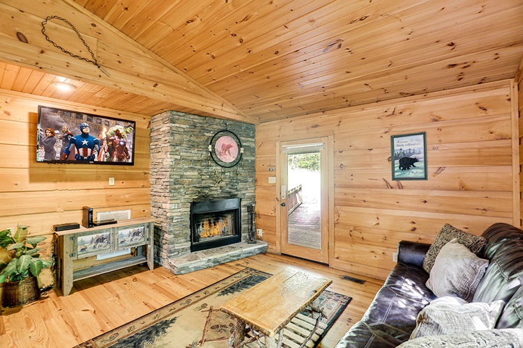 Relax in the open-concept living area, featuring a wood-burning fireplace that adds warmth and ambiance to the space. The cabin is thoughtfully designed to provide a comfortable and welcoming atmosphere for guests. - Fully Equipped Kitchen
