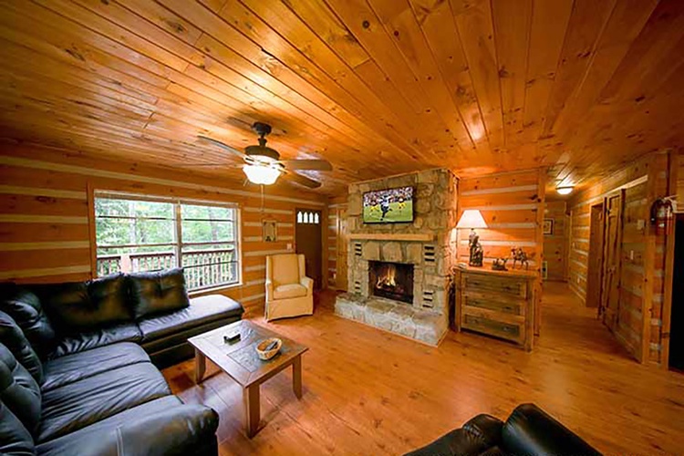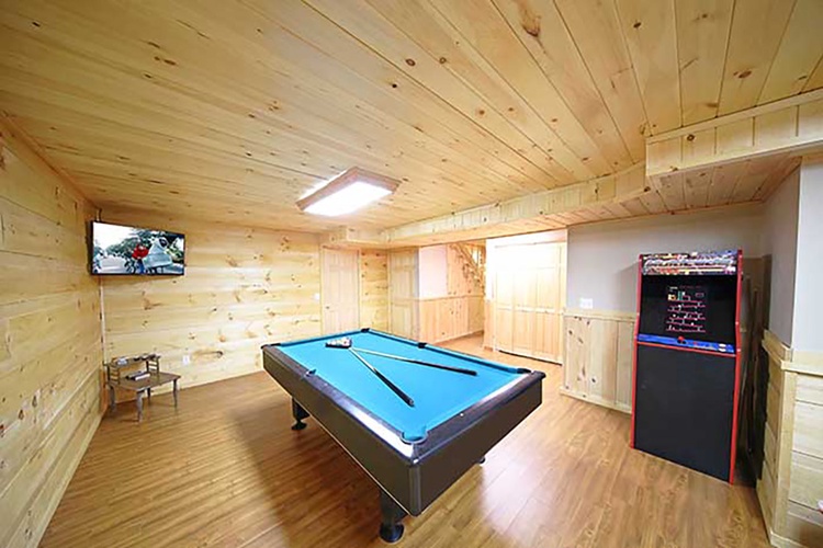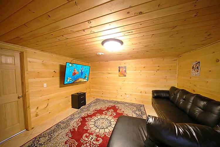 The cabin boasts a game room equipped with a pool table and arcade game, catering to guests of all ages. For movie enthusiasts, a dedicated space is there for your enjoyment.