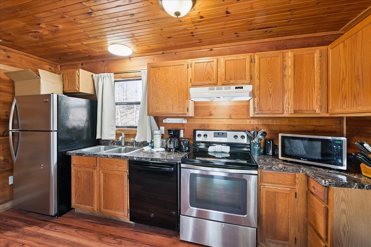 A full kitchen with modern appliances makes home-cooked meals easy, and a charcoal BBQ on the deck adds to the al fresco dining experience. This cabin uses a private well water system with naturally hard water. The water is safe to consume and does not have sulfuric odors. - Additional Conveniences