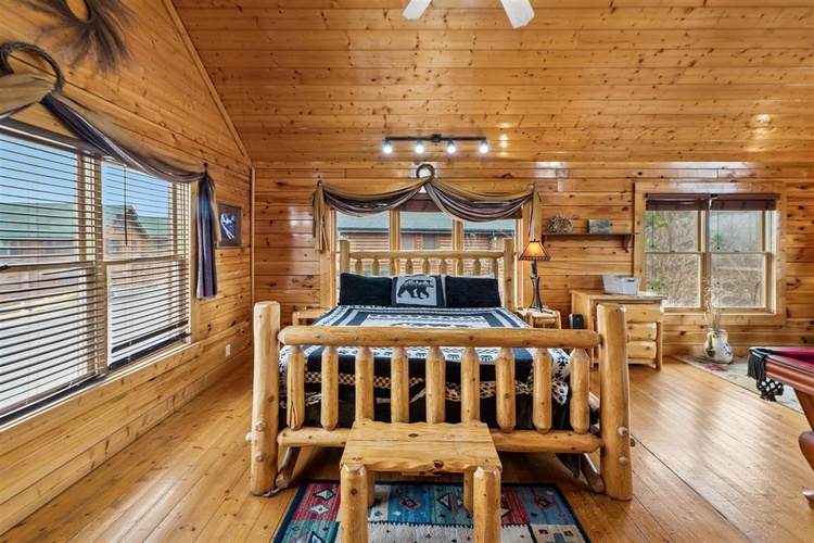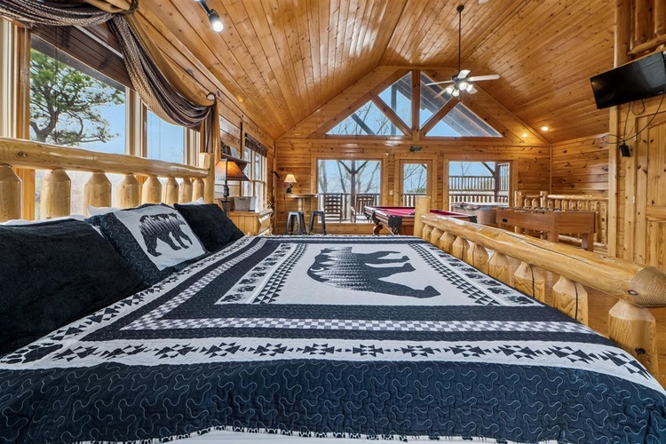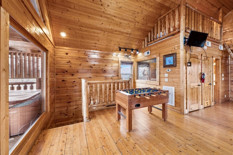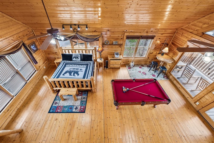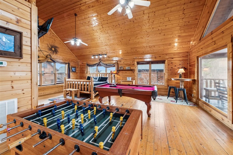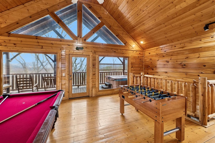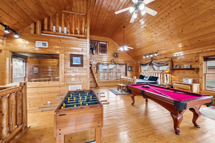 Vaulted ceilings, rich wood finishes, and a cozy electric fireplace create a warm, lodge-like ambiance. Open-concept living includes a pool table, foosball table, and lofted sleeping area for kids or extra guests.