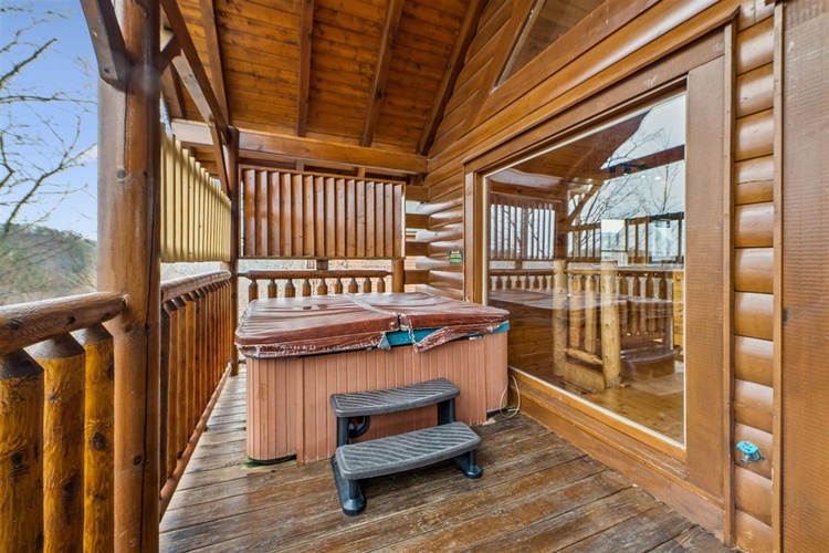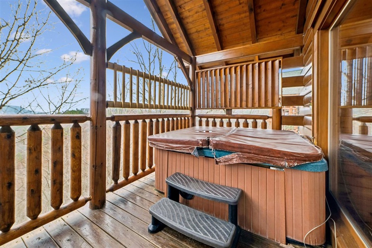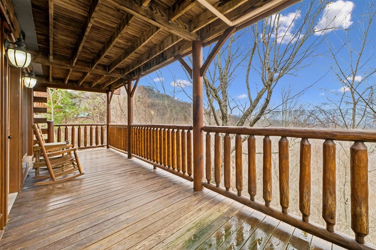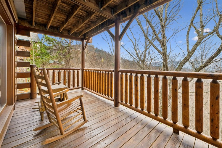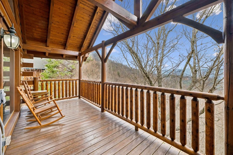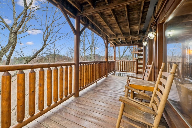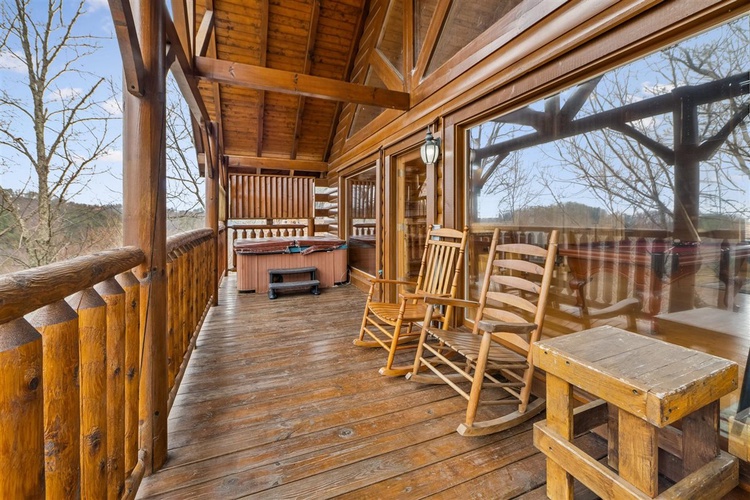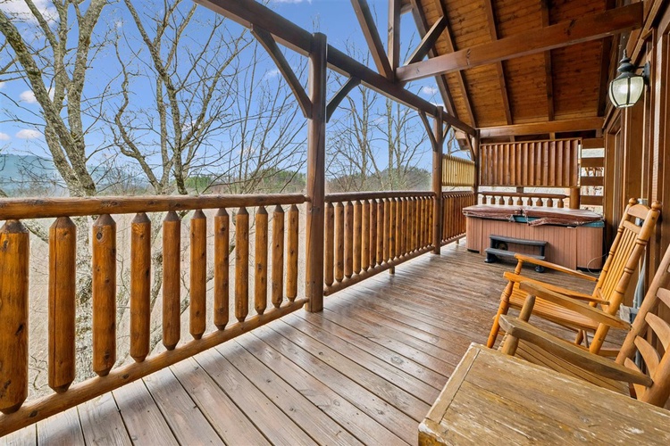 Handcrafted rocking chairs, a porch swing, and a hot tub grace the top deck—perfect for taking in the sunrise, autumn foliage, or peaceful evenings under the stars.
