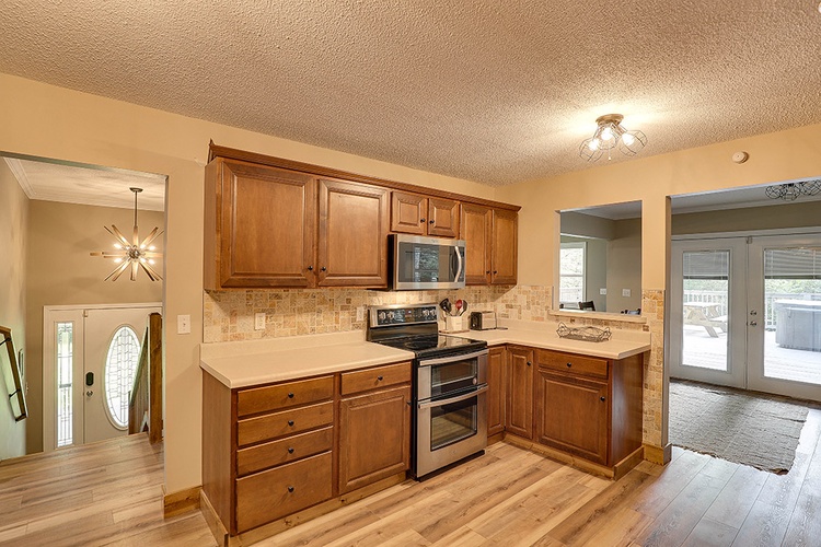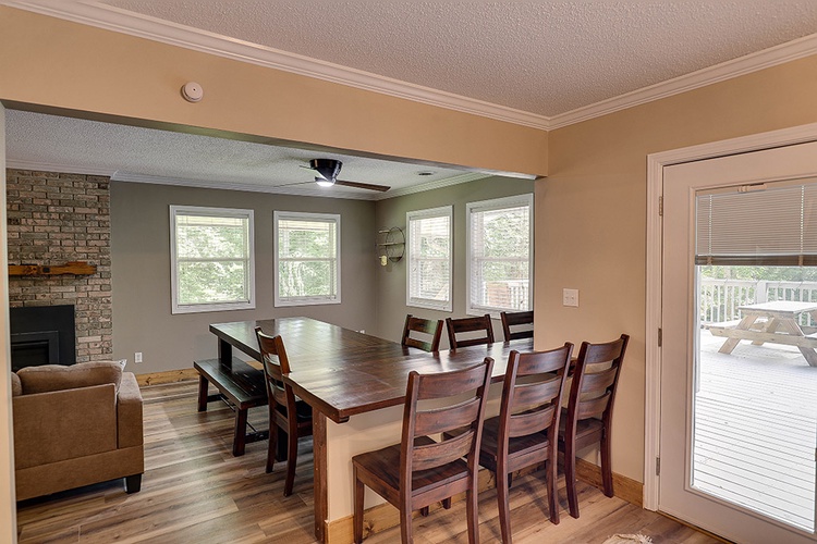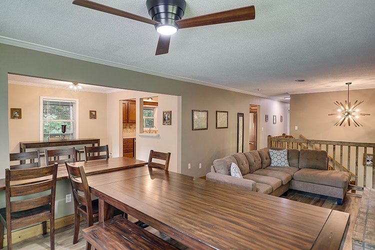 Cozy up in the great room, warmed by a stone fireplace. The full kitchen and adjacent dining area make it easy to enjoy hearty home-cooked meals together.