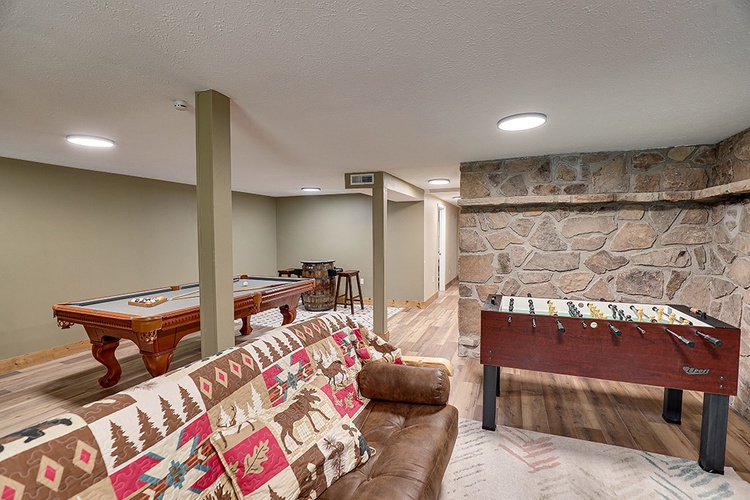 The lower-level game area features a pool table, arcade games, and foosball. Luxuriate in the private hot tub, enjoy movie nights by the fire, or challenge friends to cornhole under your personal picnic pavilion.