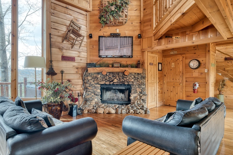 - Entertainment & Recreation: Enjoy hours of fun in the game room, complete with a pool table, bumper pool/card table, and a gas fireplace. The living room exudes country charm with a river rock, wood-burning fireplace, flat-screen television, and plenty of seating.