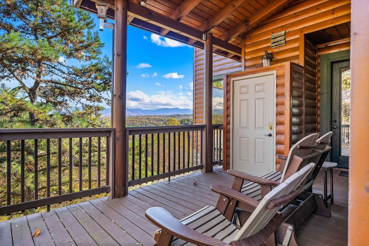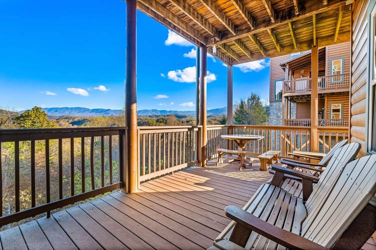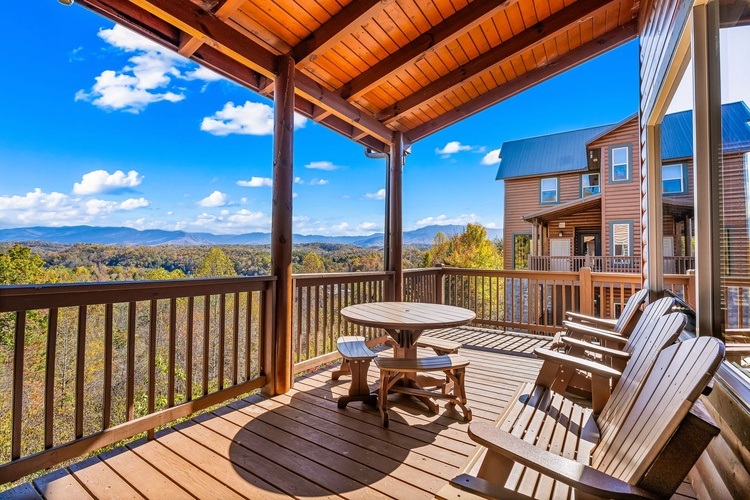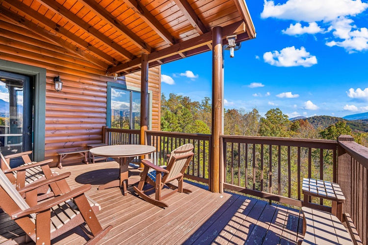 Multiple decks with forest and mountain vistas, private hot tub, fire pit, rocking chairs, and BBQ grill create unforgettable outdoor moments. - Resort-Style Amenities Included
