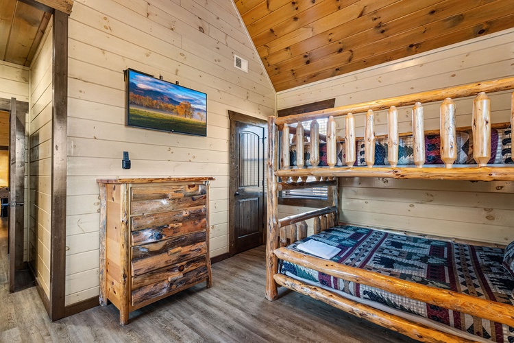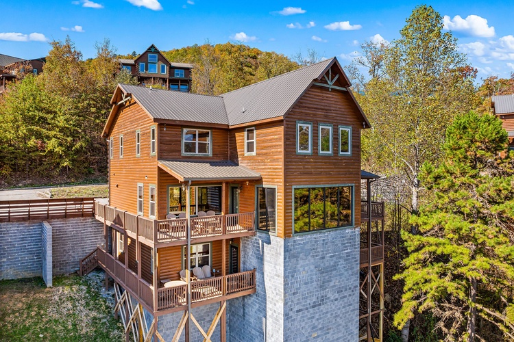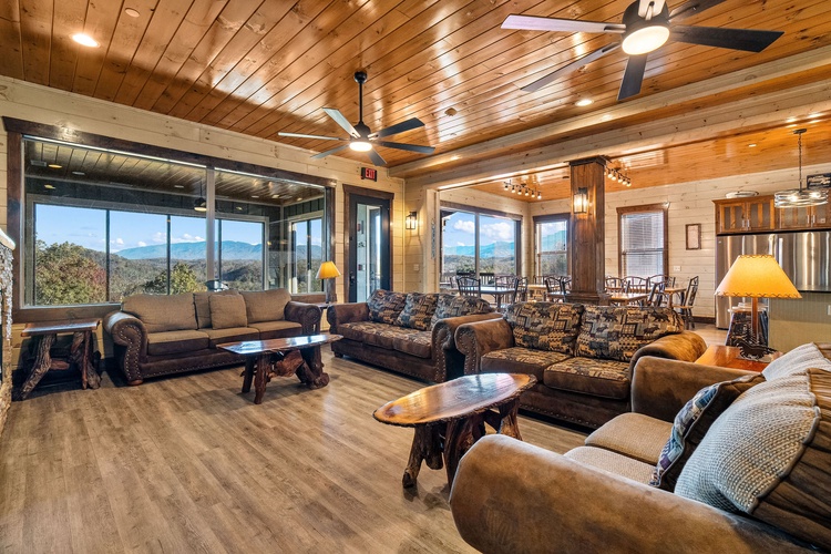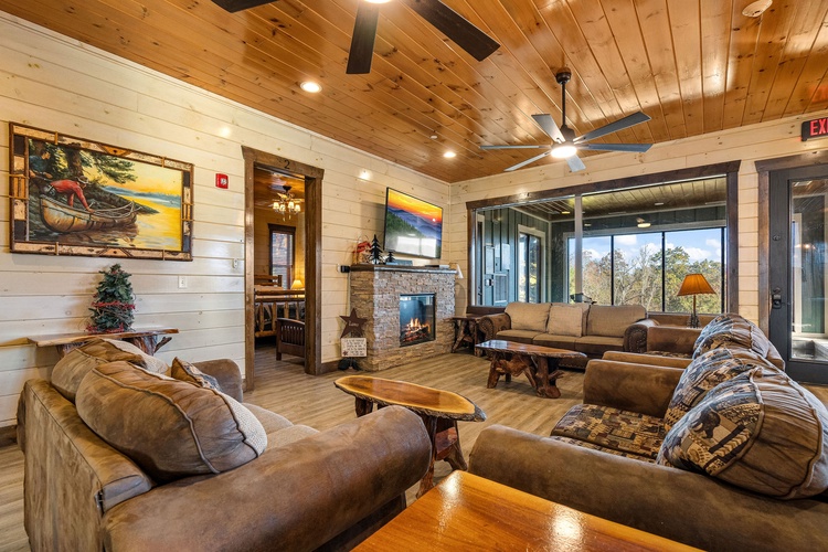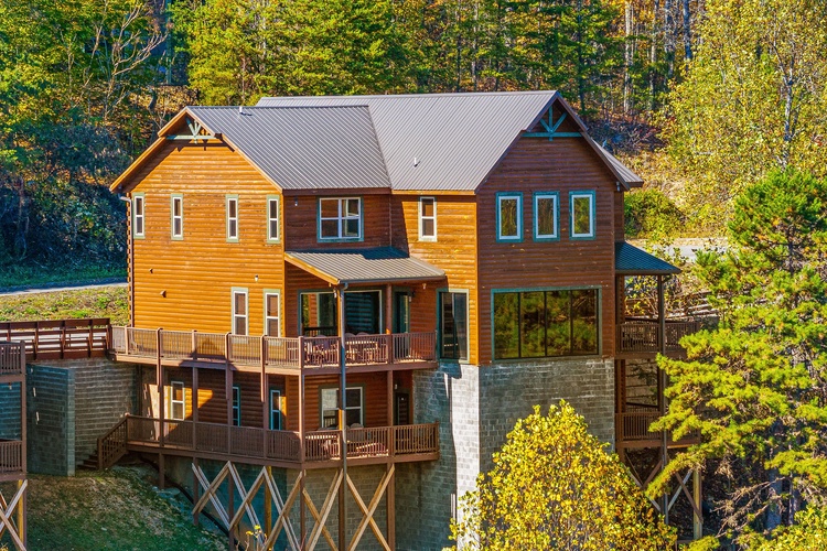 Nestled in the Wildbriar Resort community of Sevierville, Mountain Aqua Lodge is a stunning 13-bedroom, 14-bathroom log mansion that accommodates up to 62 guests. Combining upscale hotel-style amenities with the tranquility of the Smoky Mountains, this property offers a luxury experience ideal for family reunions, corporate retreats, or group celebrations.
