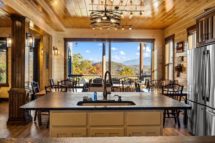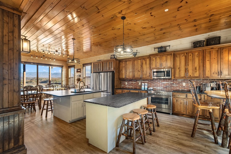 A chef's kitchen with wet bar, double refrigerators, and ample workspace supports group dining, while spacious living areas center around cozy fireplaces. - Scenic Outdoor Living