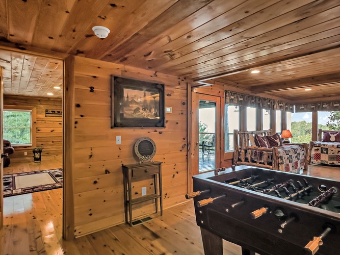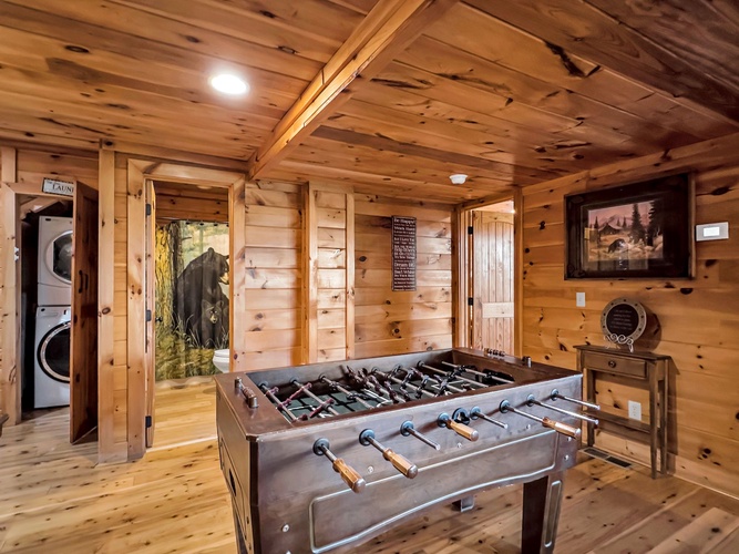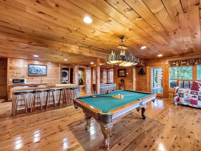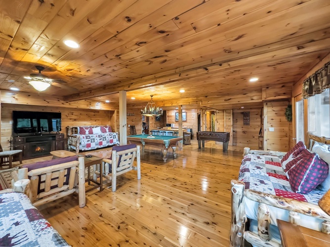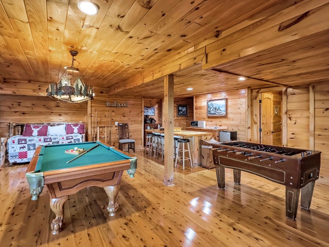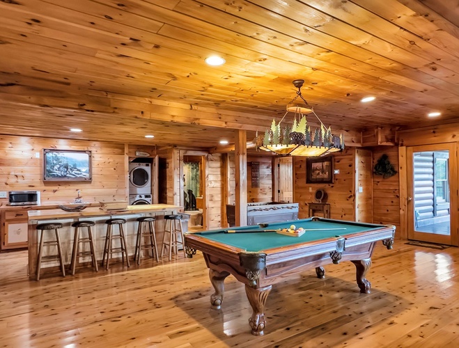 - Entertainment: The game room is a hub for fun, featuring a pool table, foosball, and a wet bar with a mini-fridge. A electric fireplace adds warmth and ambiance to the space.
