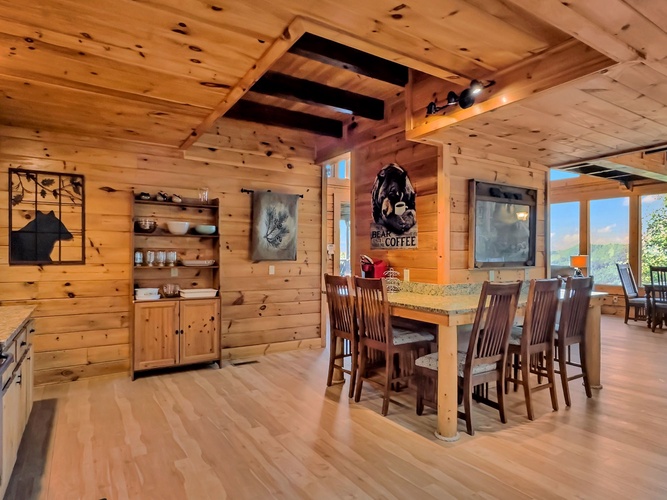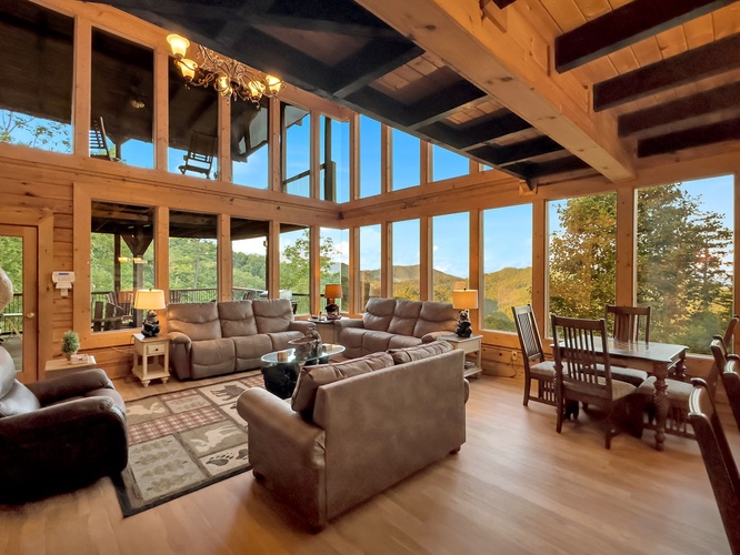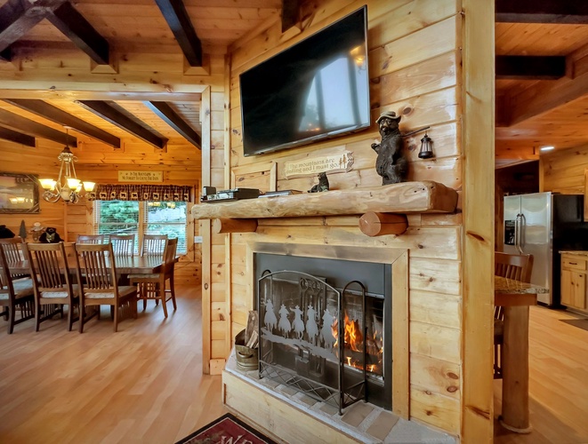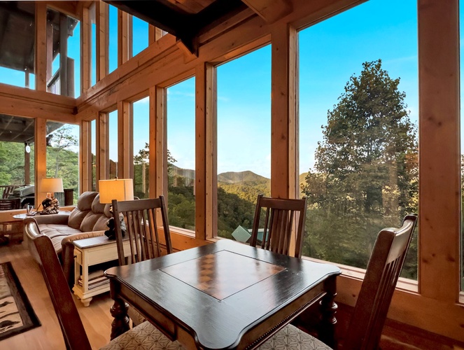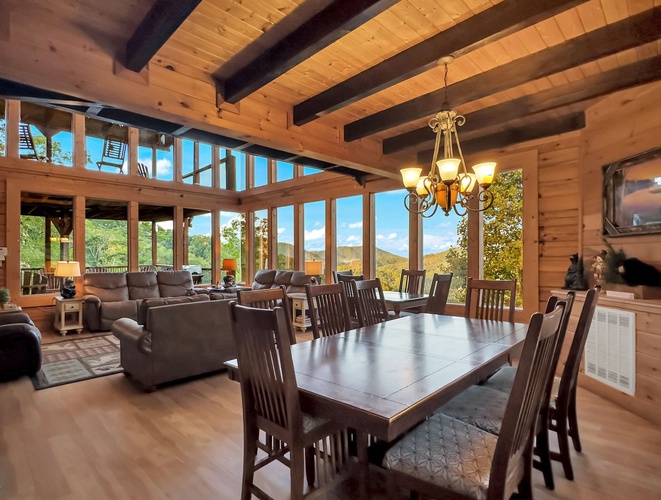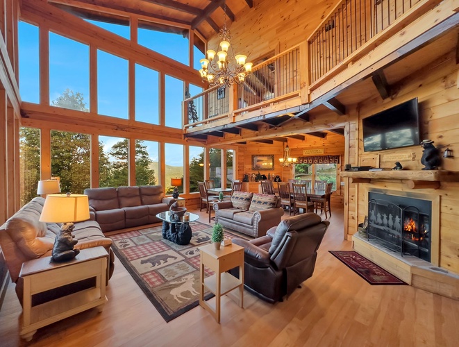 - Living Area: The spacious living room boasts floor-to-ceiling windows that flood the space with natural light and offer stunning mountain views. Guests can relax by the wood-burning fireplace or enjoy a movie on the flat-screen television.