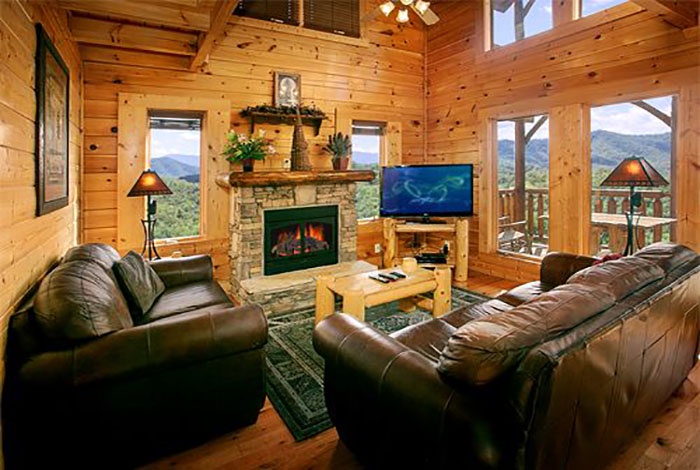 • The vaulted living room feels welcoming and warm, anchored by an electric (or wood‑burning) fireplace and a plush queen sleeper sofa—ideal for chilly Smoky Mountain evenings.