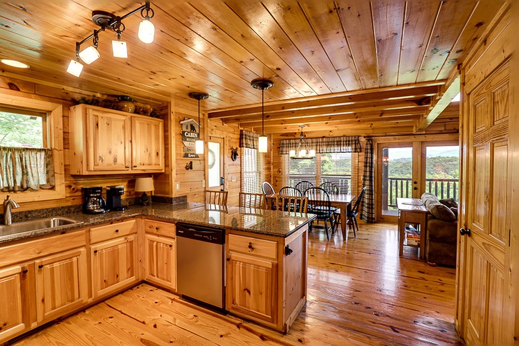The living room features a gas fireplace, large-screen TV, plush seating, and a sleeper sofa—perfect for relaxing evenings after a day of adventure. - Well-Equipped Kitchen & Dining