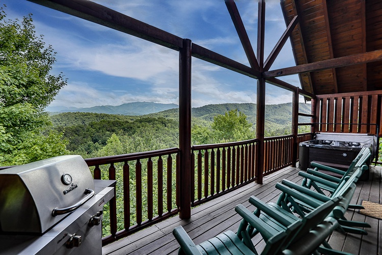 Soak in the private hot tub on the deck overlooking lush mountain ridges—serene by day, magical under starlight. - Entertainment Galore