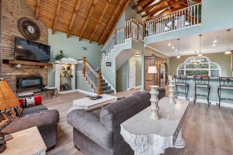 Includes a king bed, a double queen room, and sleeper sofa in the main level living room, and well-appointed studio-style living space with electric fireplace, cable TV, Wi‑Fi, and a full kitchen. - Modern Amenities