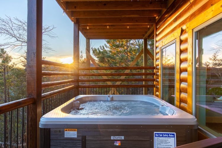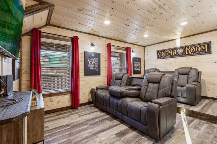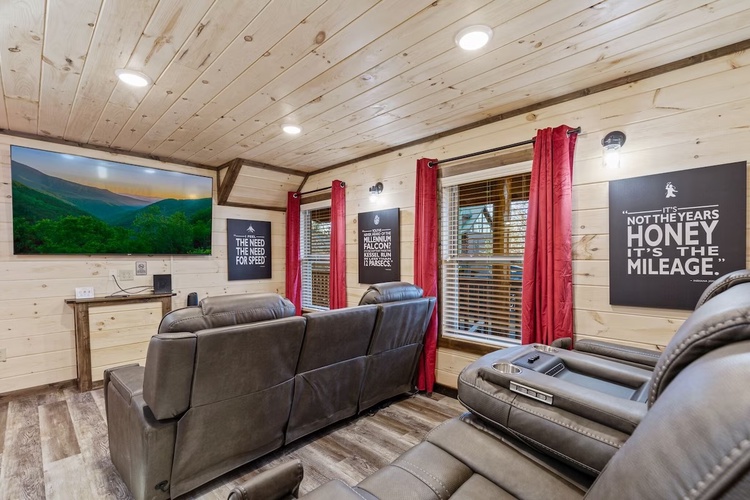 Soak in the hot tub nestled on the deck while you gaze across the ridges and river valley below—your personal spa in the Smokies. - Home Theater Comfort