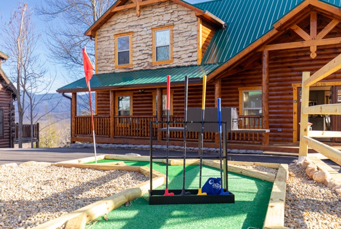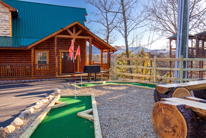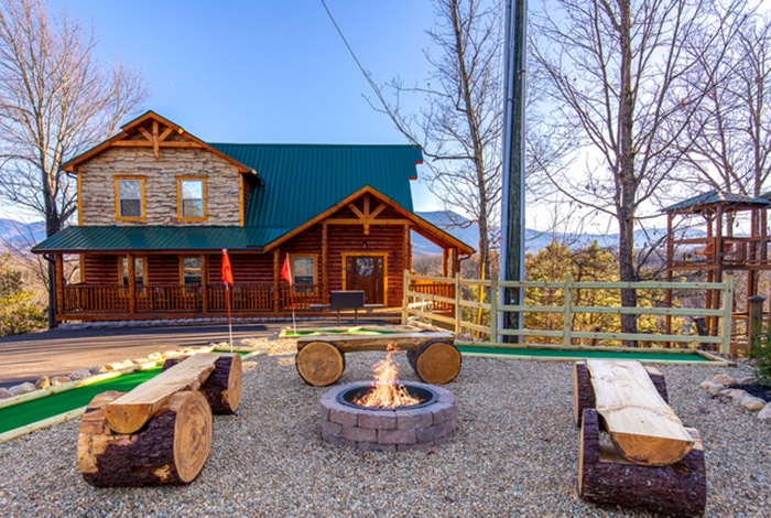 The game room features foosball, pinball, and a multicade arcade system, ideal for family competition, while the outdoor entertainment area (added Jan 2024) includes a fire pit, picnic pavilion, mini golf holes, and a large grill. - Relaxing Hot Tub Retreat