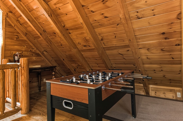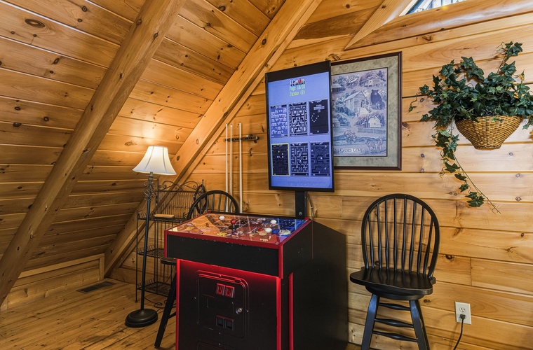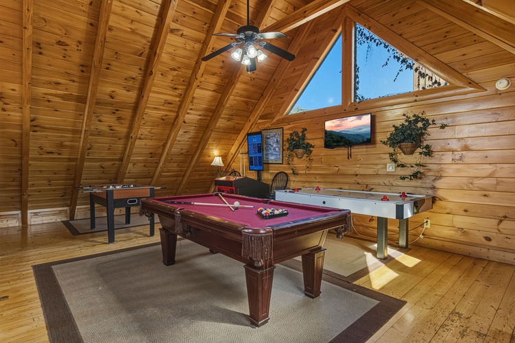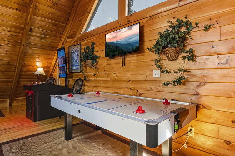 The upper-level loft features a pool table, air hockey, foosball, and a multicade arcade system—guaranteeing hours of fun for all ages. - Relaxation & Hot Tub Retreat