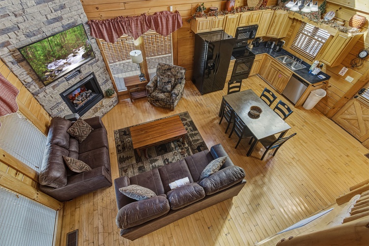 Relax in the grand living area with panoramic Smoky Mountain views and an electric fireplace—perfect for cozying up in the evening chill. - Game Loft Extravaganza