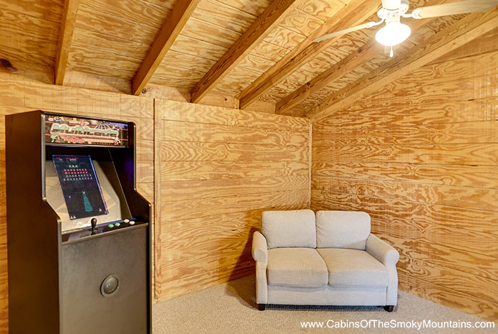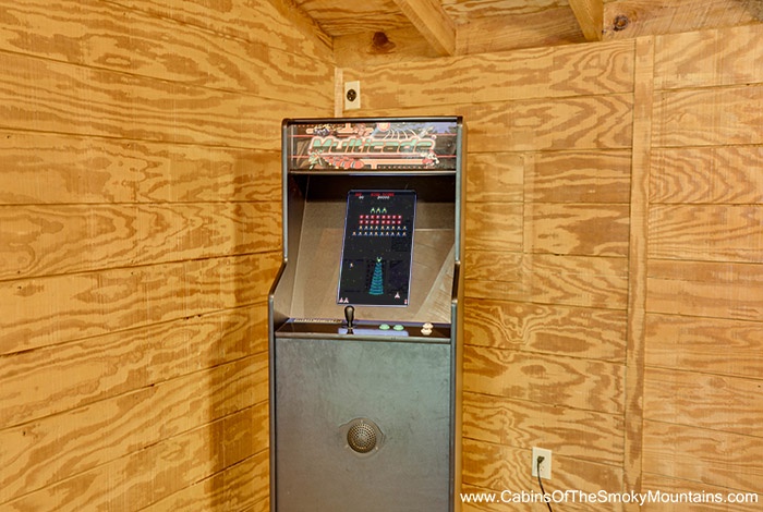 A multicade arcade system provides hours of entertainment inside, while a picnic table and outdoor fire pit invite marshmallow roasts and sunset stories. - Flexible Sleeping for Groups
