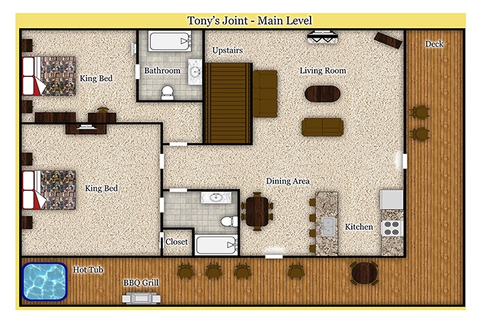Unwind in the bubbling hot tub on the deck after a day exploring the mountains—ideal for soaking beneath the stars. - Charming Cabin Layout