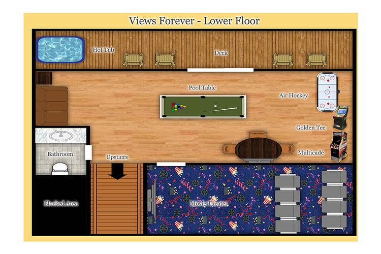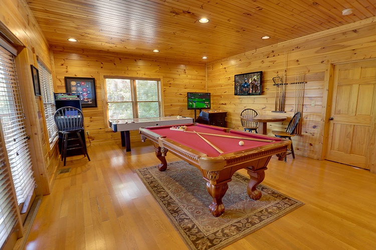 Engage in friendly competition with the upstairs game loft featuring a pool table, air hockey, and multicade arcade system, or relax with a movie in the cozy home theater. - Heated Hot Tub on Scenic Deck