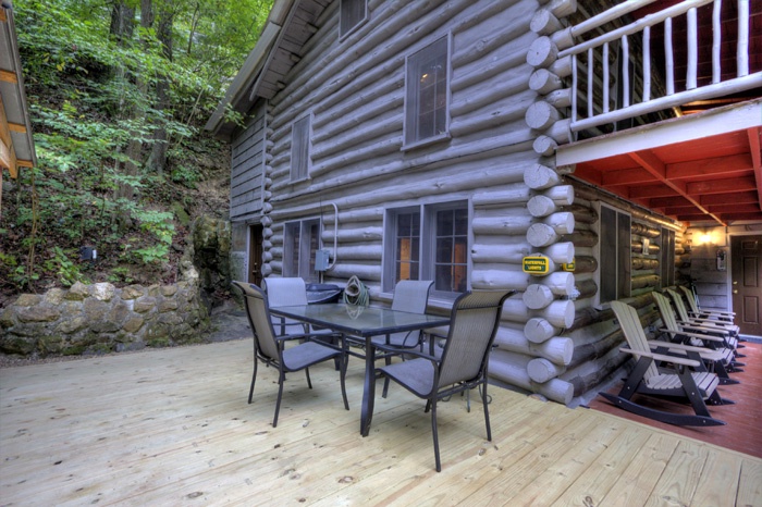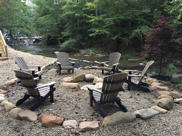 Ample outdoor seating includes rocking chairs, a picnic table, and a charcoal BBQ—ideal for creekside meals or morning coffee. Inside, enjoy modern comforts like A/C, cable, Wi‑Fi, and an electric fireplace.